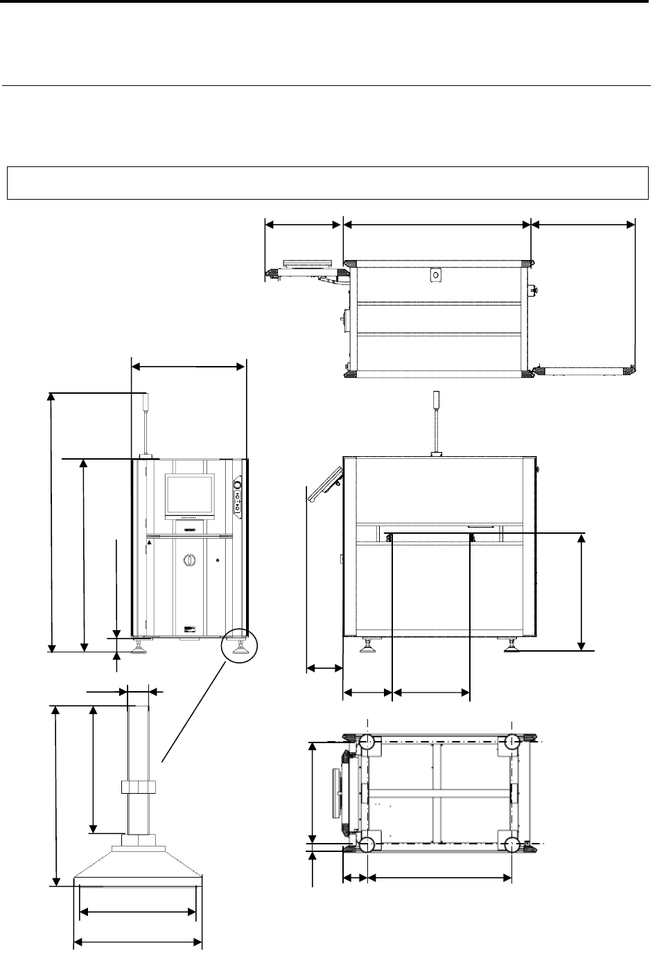 第 1 章 概要 1-2 1.1 本装置概要 本装置用于对基板的焊锡及元件贴装 状态进行自动检查。 运用独特的彩光高亮度图像处理技术 进行检查、并将检查结果输出到 显示器(触摸屏)上。 并且,将良品基板与不良品基板的区 分信号输出至下游装置。 1.1.1 外观尺寸图 (単位 mm 公 差 IT 16 ) 调节螺栓详细尺寸 φ 1 10 φ 120 120 170 M20 792 59 1 122 194 1510 (最大 620 ) (…