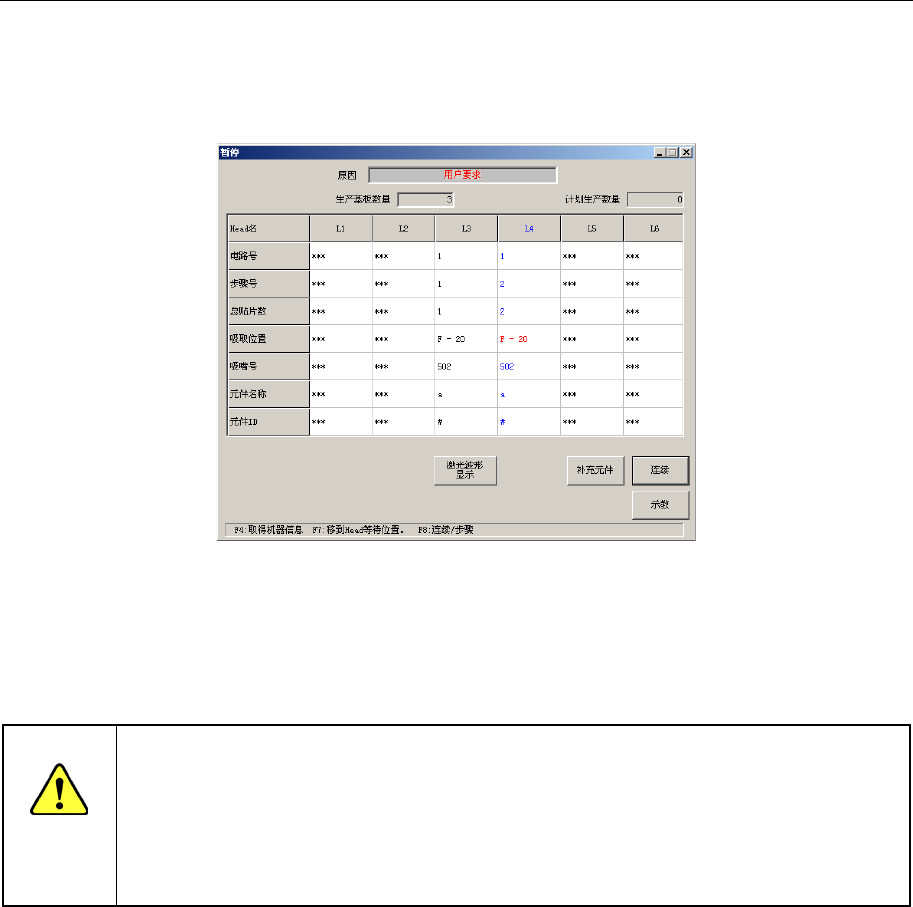 2) 在步骤生产中停止,或在连续生产中暂停时,按下键盘[F7]键,可将贴片头移动