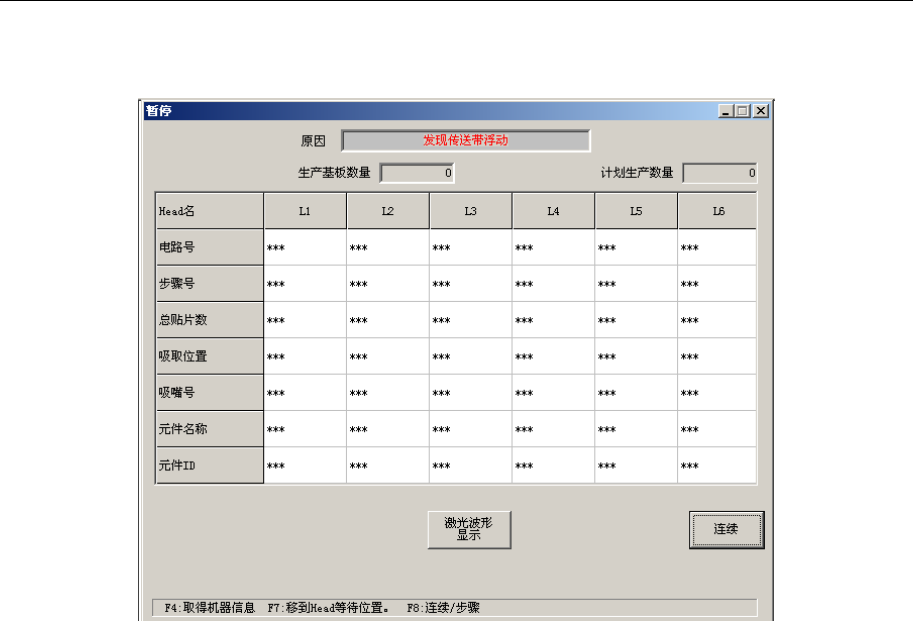 在生产运行中(XY轴移动中)检测出送料器悬浮时,会显示如下信息,并进入暂停状态。