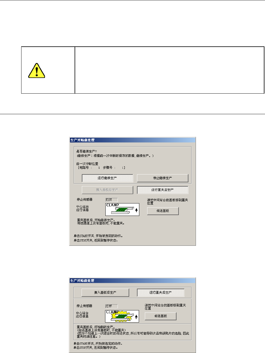 如果选择「运行重夹后生产」,则重夹传送道上的基板,开始生产时不搬入基板即再开始