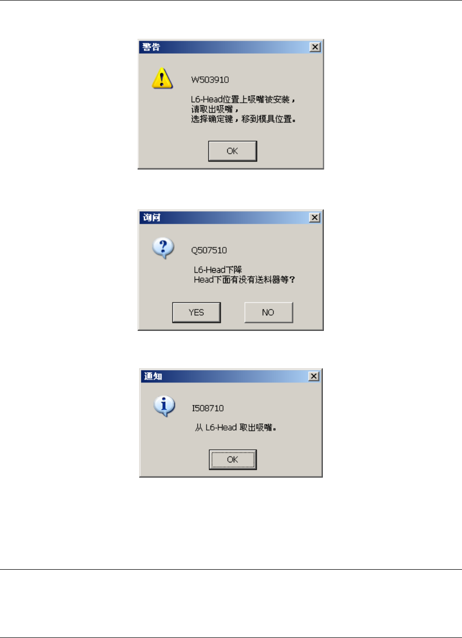 第 1 部 基本篇 第 2 章 生产 2- 11 0 2- 11 - 11 -2 手动放回吸嘴 选择手动放回吸 嘴时, 请把贴片头移 动到可拆卸吸 嘴的位置, 一边确认, 一边降下贴片 头, 手动拆下吸嘴。 图 2-11- 10 -2-1 移动吸嘴拆卸位 置信息 移动到吸嘴拆卸 位置后, 为了降下 Z 轴,请确认送料器等 是否在贴片头 的下方。 图 2-11- 10 -2-2 下降确认信息 Z 轴下降后,提 示拆卸吸 嘴,请手动拆 下吸…