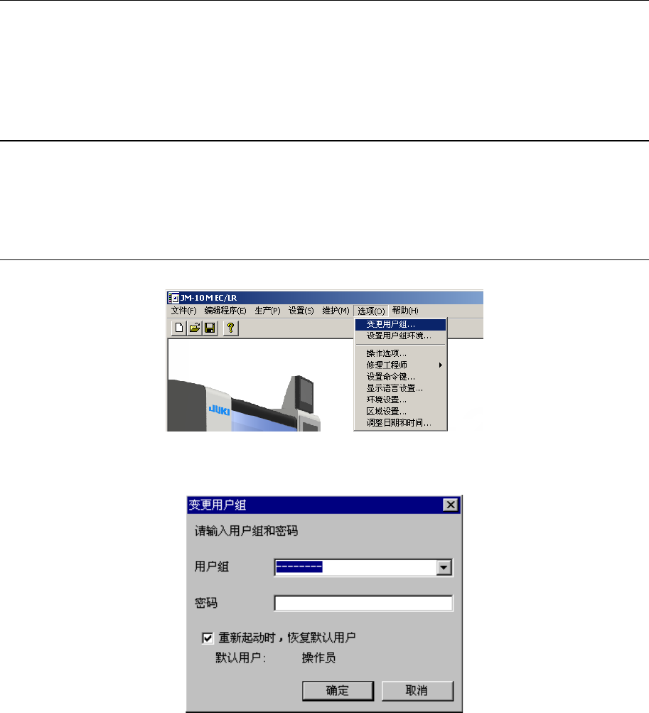 第 1 部 基本篇 第 4 章 制作生产程序 4-3 4-2-1-2 设置用户级别组 用户级别变化时可修改 输入的密码 ,也可设置默认 用户 ( 参见 4-2-1- 1 用户组 变更的“重启 动时,返回默认 用户” ) 。 下例为管理者时 的情况。 图 4-2-1-2-1 设置用 户级别组 ●不能浏览以及 变更设置 比当前选中的用 户组更高 级别的用户组密 码。 ●不能将默认用 户变更为 比当前设置的用 户组更高 的用户组。 ●管理者密…