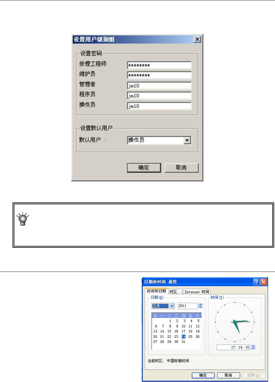 用户级别变化时可修改输入的密码,也可设置默认用户(参见4-2-1-1 用户组变更的“重启