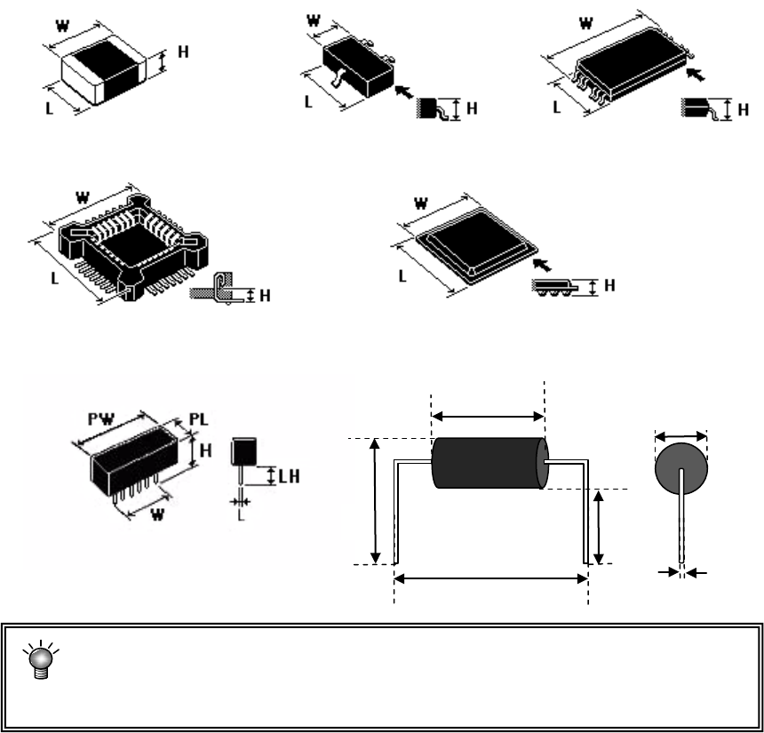 例>W = 外形尺寸 横 L = 外形尺寸 纵 H = 元件高度 LH = 引脚长度