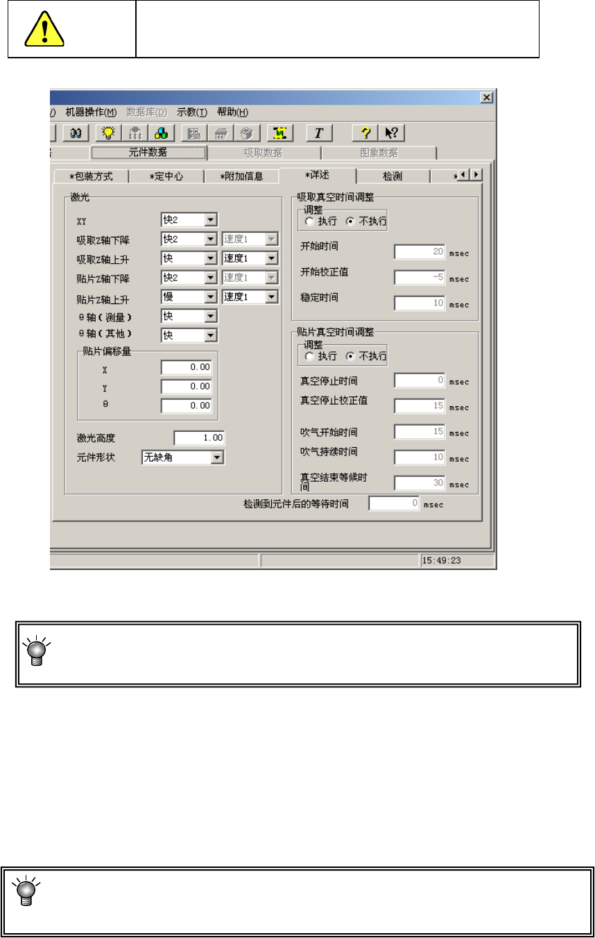 第 1 部 基本篇 第 4 章 制作生产程序 4- 67 ( 5 ) 详述(扩 展) 注意 如果在变更详述项目后变 更了基本部分项,详 述的值有可能 恢复为默认值。 图 4-3-5-2-11 元件 数据 ( 详述 ) 环境设置中设置了 简易输入模式 时(参见 4-5-3 章) ,所有项目均会显示浅色 , 不能变更数值。 要变更时,请 解除简易输入 模式。 1) “ XY ”、“ 吸 取 Z 下降 / 上升” 、 “贴片 Z 下降 / 上…