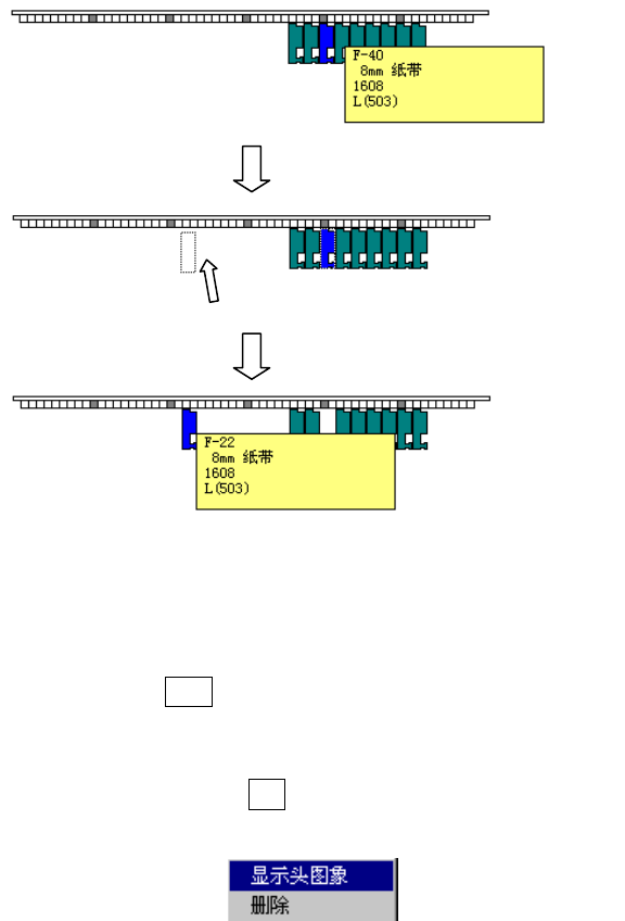 第 1 部 基本篇 第 4 章 制作生产程序 4- 150 ⑤显示 贴片头 图像 把 供料器编排窗口显示 模式,切换为 贴片头 图像显示模式。 点击鼠标右键即可显 示贴片头 图像。 贴片头 图像 显示模式中, 以图 像形式显示贴 片头的间隔。 把供 料器对准贴片头 间隔进行编排 , 即可按指定同时 吸取。 图 4-4-2-5-5 贴片头 图像显示模式中显 示例 要解除贴片头 图像 显示模 式,点击鼠标 左键即可 。 ⑥线对称复制 、点对…