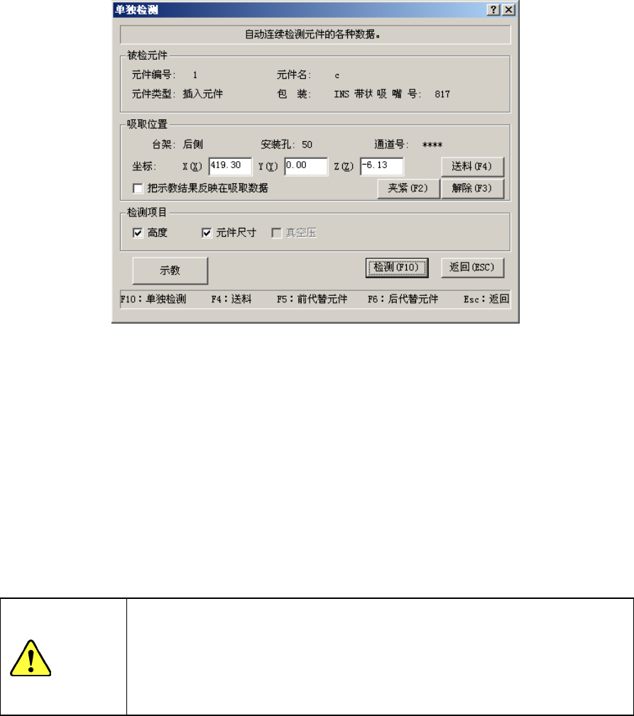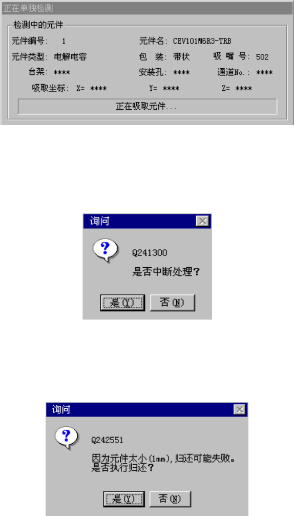 在单独检测过程中,显示如下画面。显示正在进行单独检测的元件的内容及吸取位置,