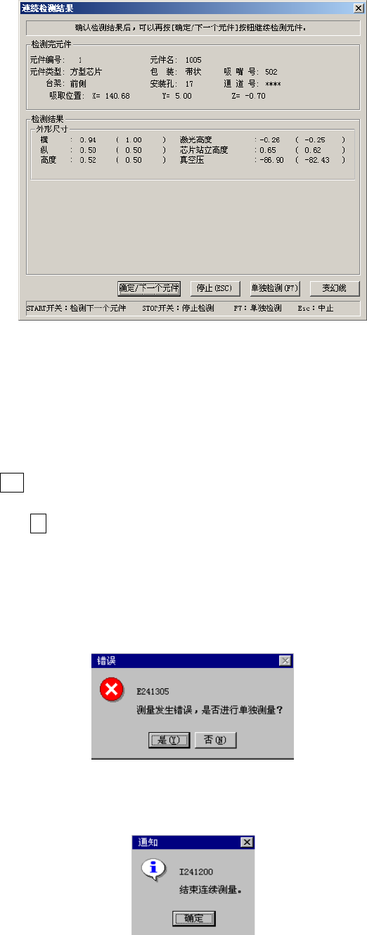 连续检测过程中显示如下画面。显示连续检测的元件内容及吸取位置,依次显示处理