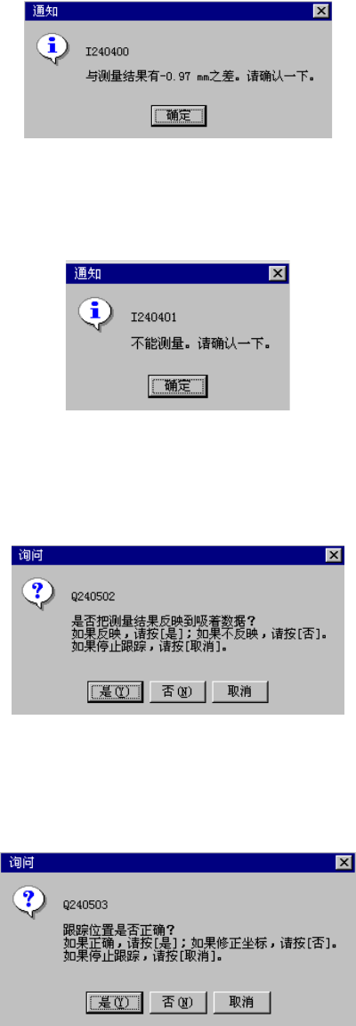 第 1 部 基本篇 第 4 章 制作生产程序 4- 261 6) 跟踪吸取高度各 点时的动作 ① 如果在跟踪吸取 高度的条 件设定中已设定 了 “与测量值间有差异则停止” , 则与测量值间有 差异时, 会显示如下信息 。 自动传送将停止 ,请确认 吸取数据的高度 值。 ② 如果在跟踪吸取 高度的条 件设定中已设定 了 “如果无法测量则停止” , 则无法使用 HMS 测量时,会显 示如下对话 框。 自动传送将停止 ,请确认 吸取位置。 ③…