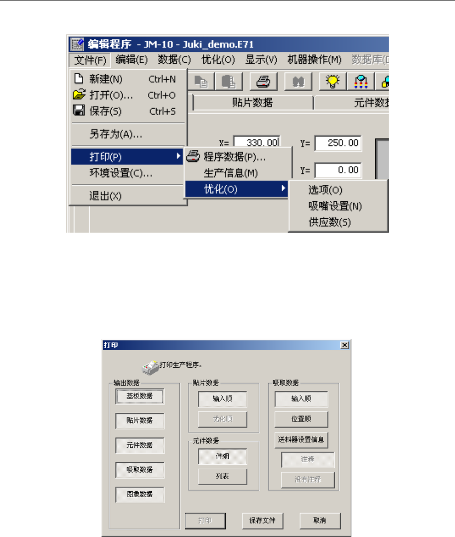 第 1 部 基本篇 第 4 章 制作生产程序 4- 266 4-5- 5 打印 选择 「文件」 / 「打印」 ,从 「 程序 数据 」 、 「 生产信息 」 、 「 优化 」 中选择要打印 的项目。 优化时需要进一 步选择「 选项」、「吸嘴 设置」 、「 供应数 」。 图 4-5-5-1 生产程序编辑显示的打印菜单 ● 「 程序数据 」 :打印生产程序的内容。 选择要打 印的内容, 单击 「 打印 」 。 如果单击 「文本文档」 , 可…