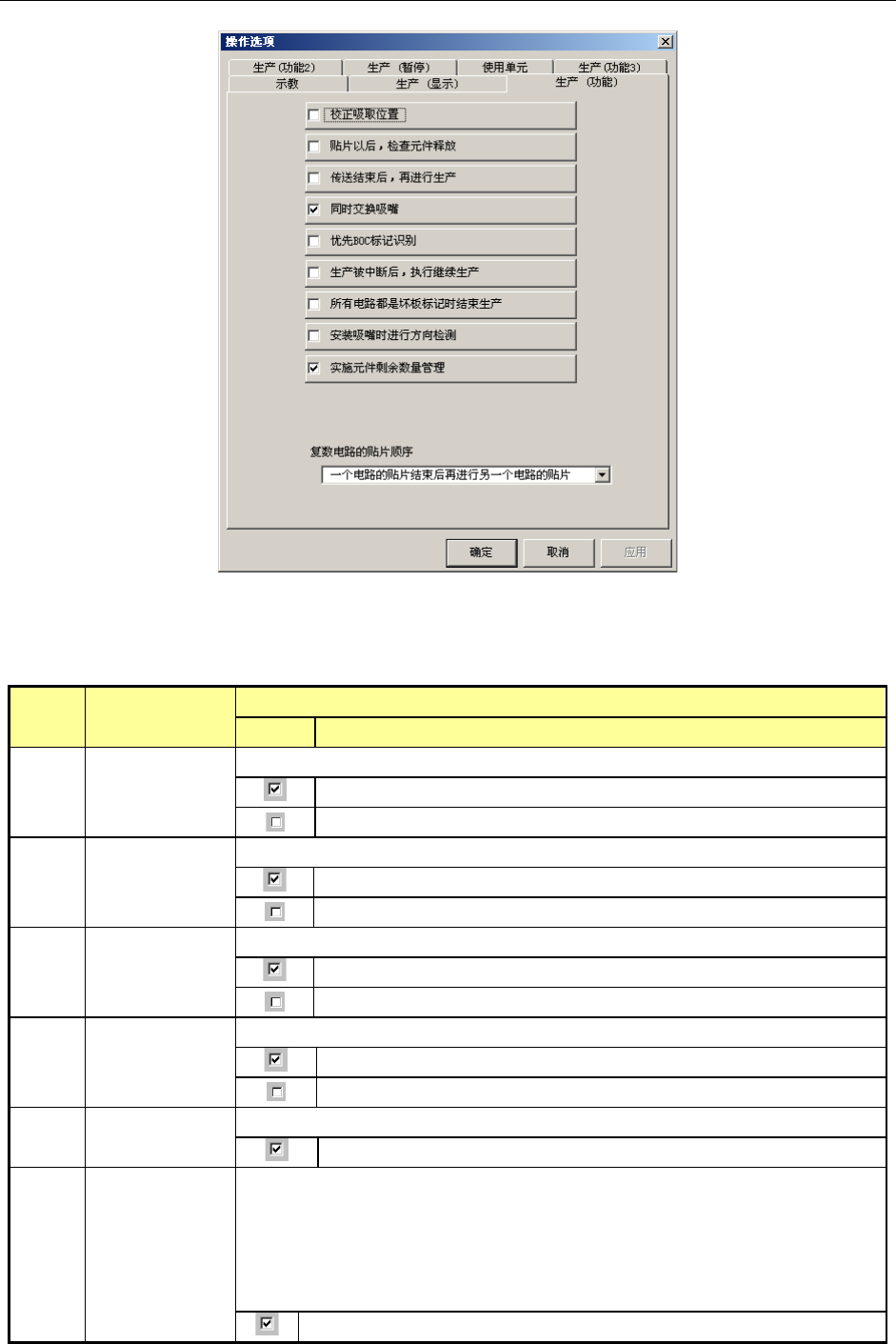 第 2 部 功能详解篇 第 5 章 操作选项 5-5 7 不是继续生产时 , 缺省 为「搬入基板后 生产」 当生产开始前的 对话框显示的不是继 续生产, 而是可 选择初始生产动作 ( [ 搬入基板后 生产 ] ,或 [ 重新固定基板后 生产 ] ) 时, 可 设置默认值。 执行 [ 搬入基板后生产 ] 。 执行 [ 重新固定基板后生产 ] 。 8 生产画面中显示 总吸 取率和总贴装率 通过复选框对生 产中画面里 [ 总吸 取率 ] 和 …