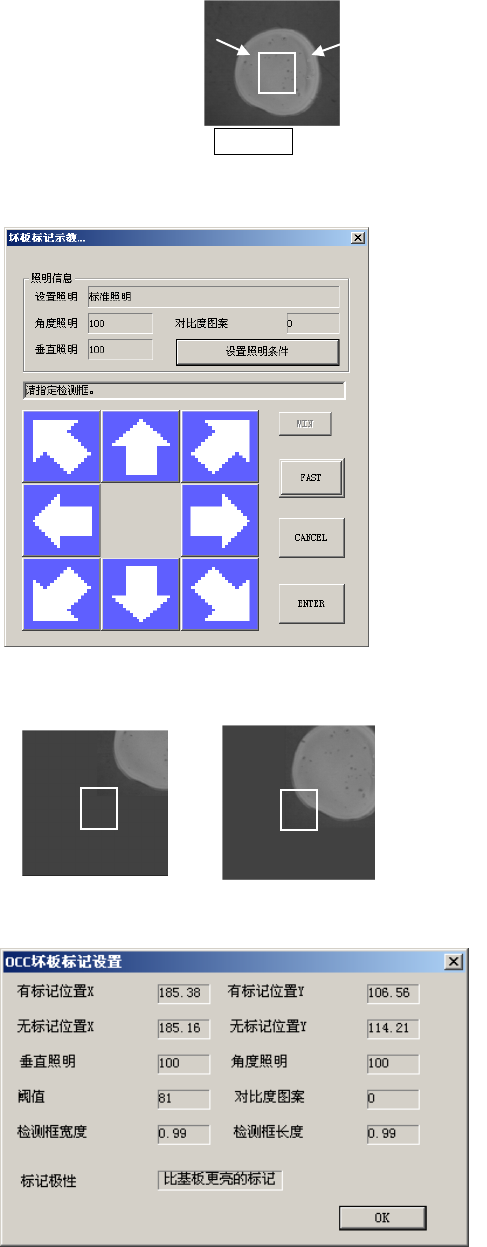 第 2 部 功能详解篇 第 6 章 机器设置 6- 32 确认坏板标记位 置的坐标 后,指定检测框 (左上、 右下) 。 设置检测框时, 其位置选 在标记里面,具 体请参见 下图。 用 H OD 的方向键变更检测框 尺寸,按 ENTER 键或按钮确认。 确认检测框后, 要进行取 得阈值的操作。 交互进行 有标记位置与无 标记位置 的识别操作。 图 6-5-9-3 坏板标记示教 画面 进行上述动作时 ,请注意 无标记检测框不 要与标记 重…