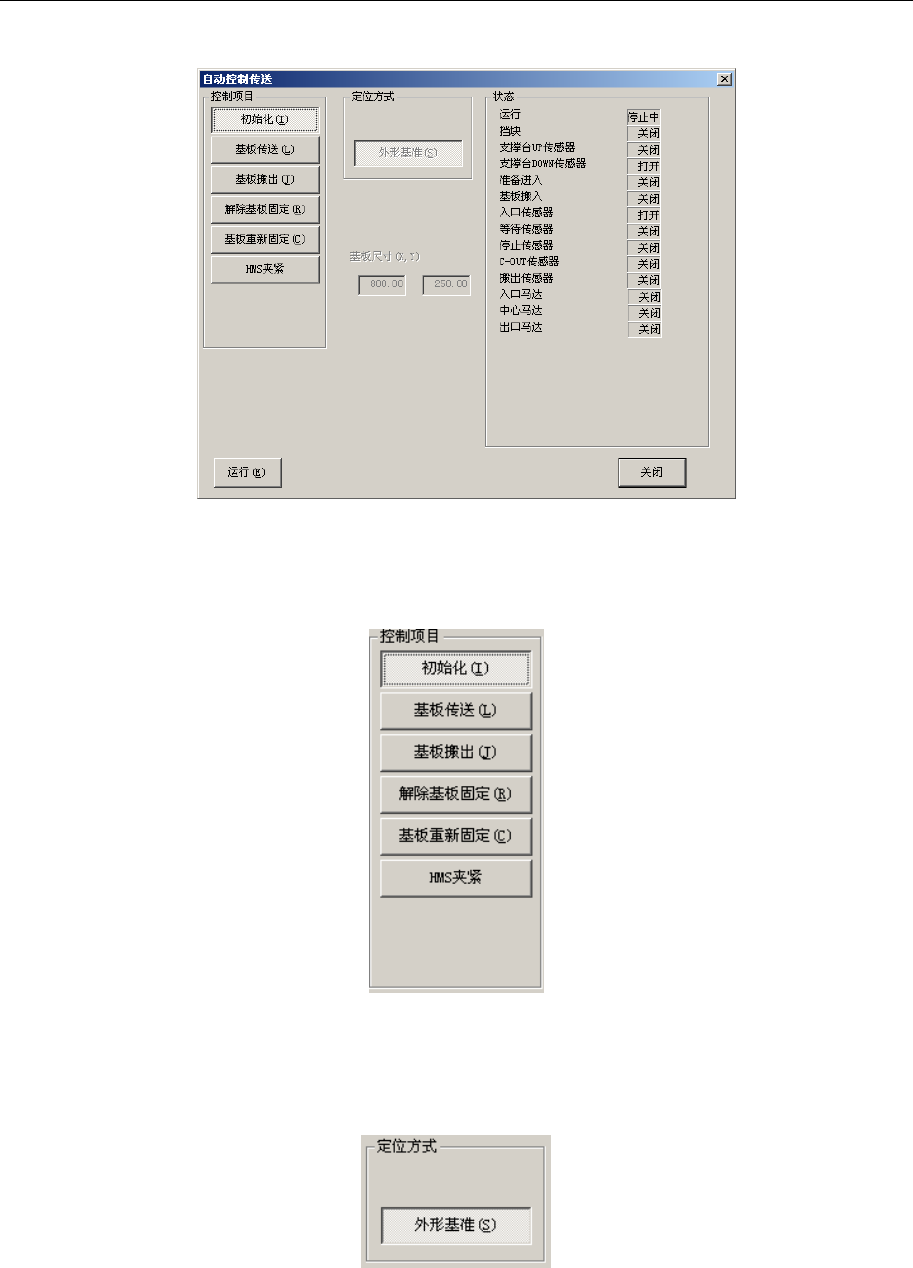 第 2 部 功能详解篇 第 7 章 手动控制 7- 22 (3) 控制按钮 用控制按钮来执 行控制项 目。 选择控制项目后 ,按 [ 执行 (E)] 按钮或按下 [F3] 键进行控制 。 1) 初始化 将基板传送初始 化。 2) 基板传 送 根据定位方式中 所指定的 方式搬入基板。 3) 基板搬 出 将基板搬出。 4) 解除基 板固定 释放基板。 5) 基板重 新固定 按定位方式指定 的方式, 重新加紧送通道 上的基板 。 (4) 状态…