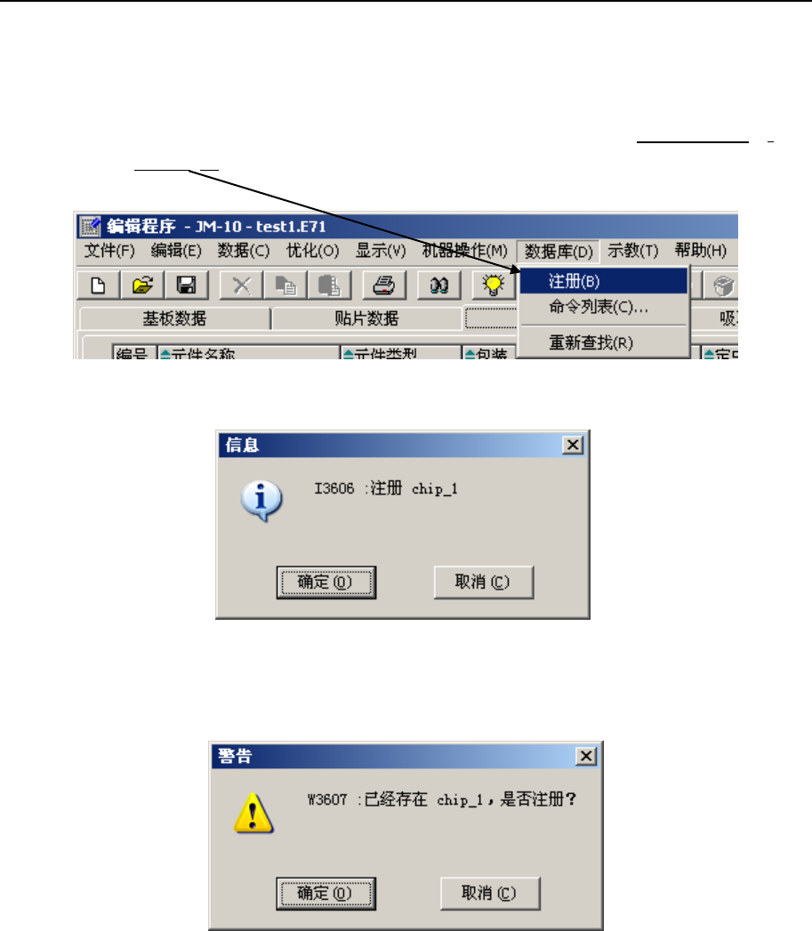 第 2 部 功能详解篇 第 11 章 数据库 11 -4 11 -1- 1 注册 从「 编辑程序 」中,逐一注册生 产程序文件的 元件数据。 < 步骤 > ① 打开「编辑 程序」的「元件数据」 。 ② 选择要注册的 元件 ( 若是清单画面 ,请先单 击元件所在行 ) ,再单击 「 数据库 」 - 「注册」 。 ③ 显示如下画面 ,单击 「确定」, 即可完成注册 。 已有同名元件注 册时,会 显示下列对话框 。 要覆盖元件数据…