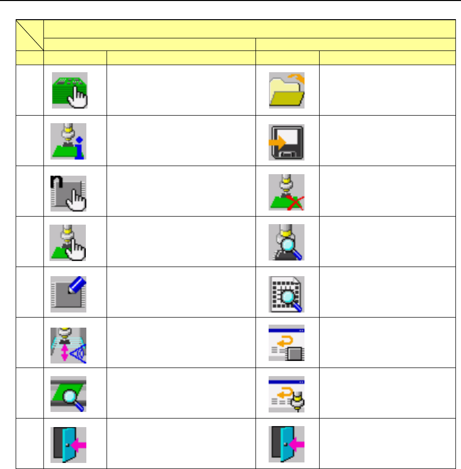 第 1 部 基本篇 第 1 章 设备概要 1- 67 1-4-2-1 桌面 换页 1/2 2/2 No. 图标 名称 图标 名称 1 打开文件 读入生产程序文 件。 2 保存文件 保存生产程序。 另存为 命名生产程序文件名后保 存。 3 编辑生产程序 装置运行信息 4 基板生产 自动校准 5 预热 操作选项 6 手动控制 通过模式 7 机器设置 文件管理 (Explorer) 8 退出 退出 JM- 10 系 统。
