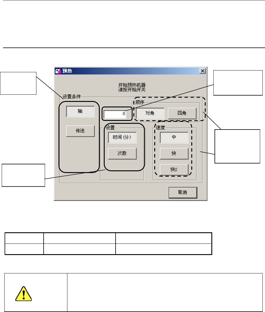 第 1 部 基本篇 第 2 章 生产 2- 16 2-4-2 条件设置 ( 1 ) 选择预热对象 预热对象,从轴 、传送中 选择(初始设置 为 [ 轴 ] ) 一项。 ( 2 ) 选择预热 结束的条件 预热结束的条件, 可以从时间、 次数中选择, 按 [ 时间 (分) ] 、 [ 次数 ] 中的任一按 钮即可(初始设 定为 [ 时间 ] )。 ( 3 )设置模式 在编辑框内输入 预热停止 的时间、次数。 结束条件,可在 下列范围 选择(…