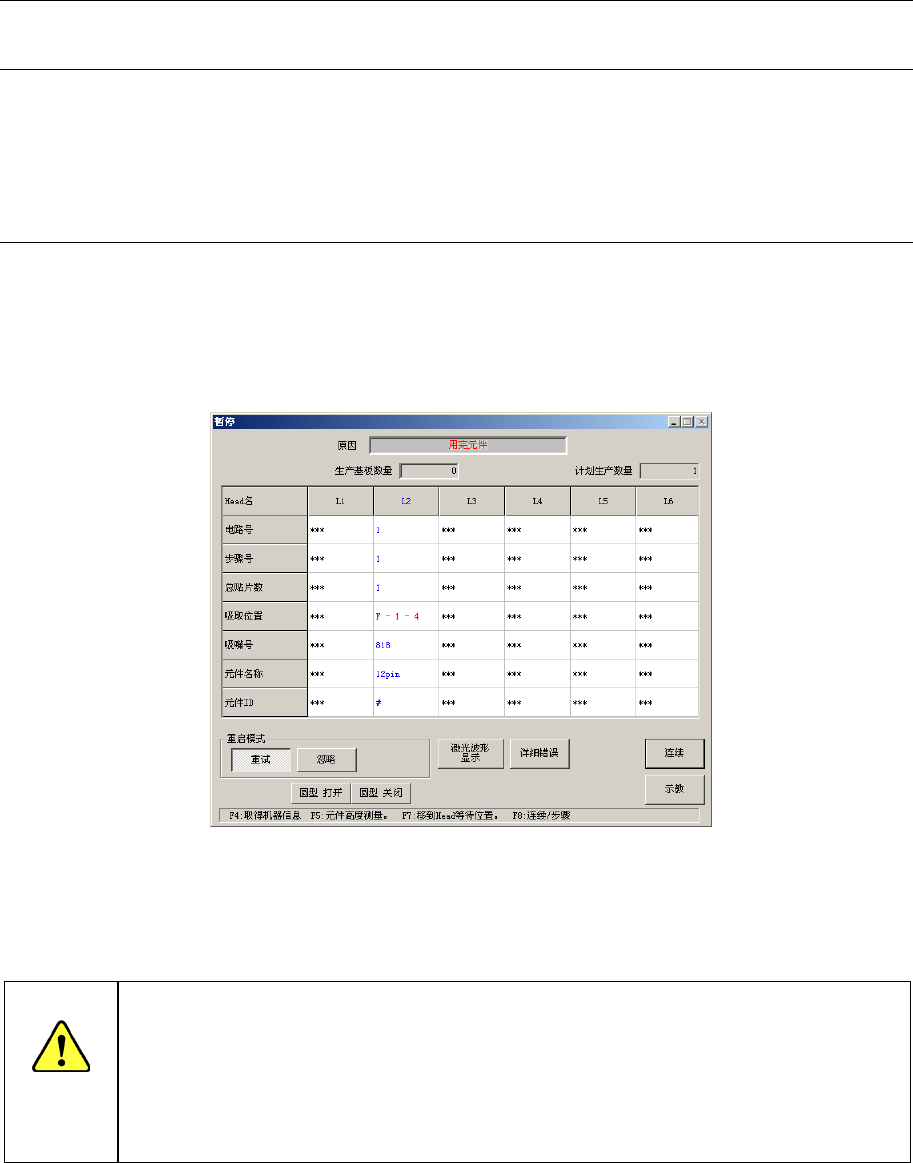 但是,若已选中操作选项中的“无元件供给时暂停”,则显示下图的画面,机器暂停。