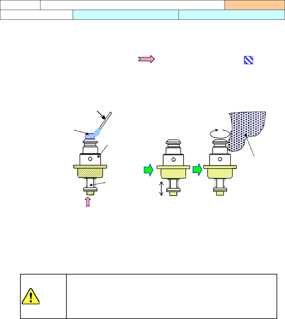 第 1 部 基本篇 第 3 章 维护 3- 23 吸嘴用超声波清 洗后放置 下来,会使吸嘴 内圈生锈 。 请按下列顺序, 在吸嘴滑 动部上油。 1) 清洗后,用气 枪等把吸 嘴内部的酒精吹 干净。 2) 在图示的润滑油 涂抹部分(把 吸嘴滑动部向 方向推入时 从吸嘴内圈蹦出的 部分), 用沾油半湿的棉 花棒滴上 一滴。 3) 把吸嘴滑动 部分上下滑动 20 ~ 30 次 ,使润滑油涂布 均匀。 4) 用干净抹布, 把吸嘴周 围多余的油擦…