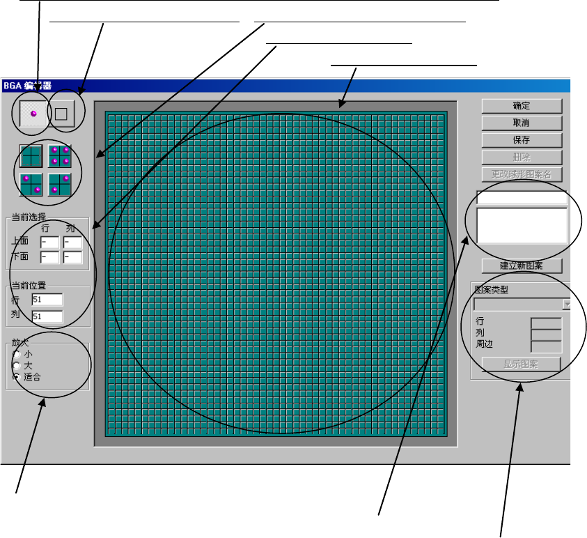 第 1 部 基本篇 第 4 章 制作生产程序 4- 11 9 2) 编辑 进行球面图案的 新建、编 辑。 可从“浏览”的 “球面图 案列表”中选择 已制作的 球面图案。 最多可登录 16 个图案。 要逐个制作球面 时选择。 制作时,左击为 制作球面 ,右击为制作索 引标记 ※ 1 用鼠标指定范围 制作时选 择。在 指定范围制作时 , 指定制作图案。 显示光标的当前 位置。 球面图案的制作 区域。 图 4-3-7-3-6 球面图 案编辑器…