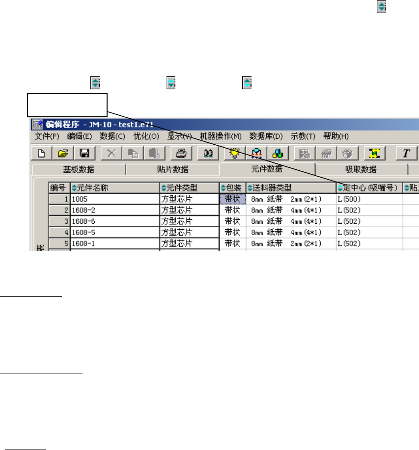 第 1 部 基本篇 第 4 章 制作生产程序 4- 166 4-5-1- 2 列表画面的功能 在编制程序画面的各种 列表上,可 以调整单元格的 宽度,使用数据 排序功能。 ( 1 ) 调整列表画面上的单元格 宽度 在贴片数据画面等列表 上,可以调 整单元格的宽度 。 当光标呈十字型 时, 把光标移到列顶 端行 (显示项目名称区) 单元格边 线附近。 光标的左右 都变成箭头时, 在保持该 状态下拖拉光标 ,即可调 整单元格的宽度 。 图 …