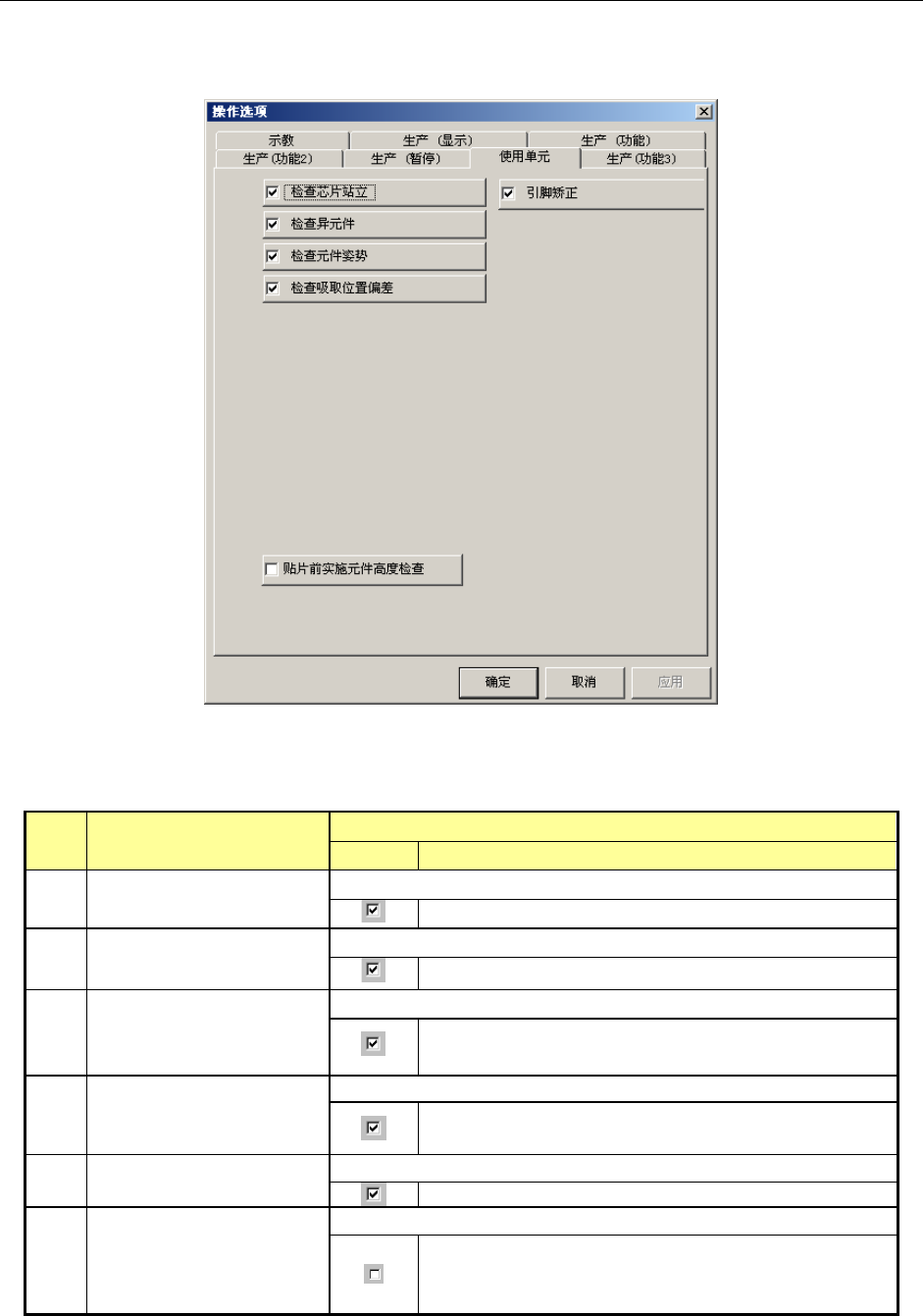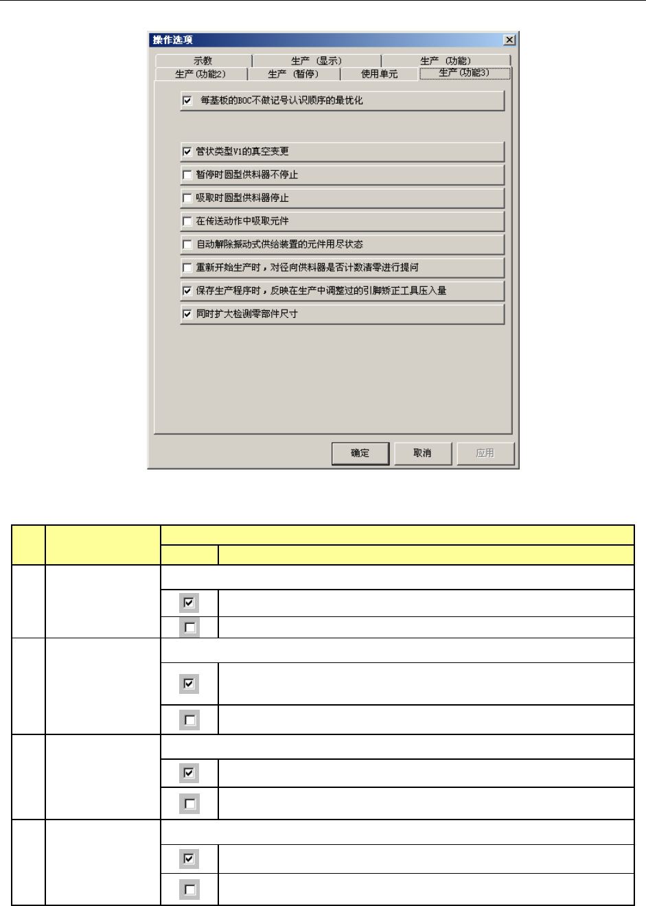 第 2 部 功能详解篇 第 5 章 操作选项 5- 13 5-2- 7 生产的功能 3 选项的设置 设置生产时 的动作 。 图 5-2-7-1 生产功能 3 选项 表 5-2-7-1 生产功能 3 选项的设 置项目及内容 No. 项目 内容 状态 动作及详细内容 1 每基板的 B OC 不 做记号认识顺序 的最优化 生产时,变更识 别 B OC 标记的顺 序。 不进行每个基板 的 B OC 标记识别 顺序优化 。 进行每个 基板的 BO…