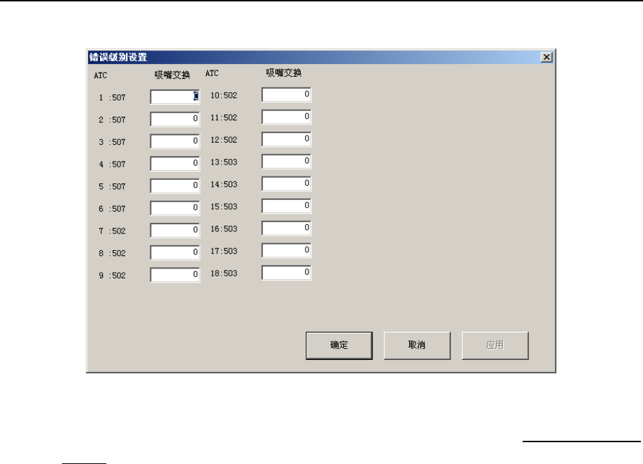 第 2 部 功能详解篇 第 8 章 设备运行信息 8-8 8-3- 4 错误级别设置 可设置各吸嘴的 错误级别 。 从菜单栏中选择 「 工具 」 / 「错误 级别设置」 / 「 各吸嘴 」 ,则显示 下图。 图 8-3-4-1 错误级别 设置画面 ◆ 如果总吸取次数 超过设置次数, 则「图 8-3-1-1 各吸嘴运行 信息 」中的 相应吸嘴会变为红 色显示。 信号灯的亮灯状 况不变。
