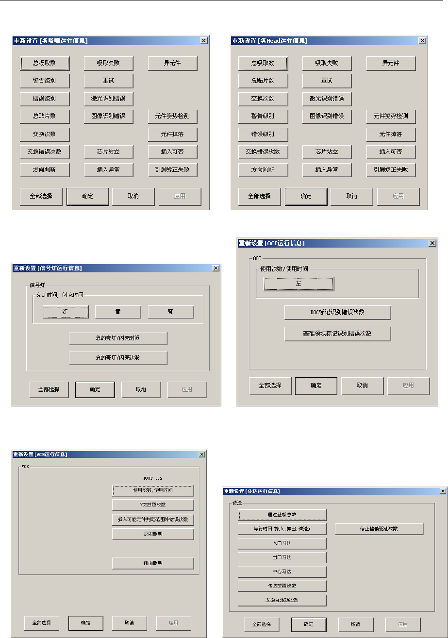 第 2 部 功能详解篇 第 8 章 设备运行信息 8- 27 图 8-5-13-2-7 重新设置异步运行信息画面 图 8-5-13-2-8 重新设置 ATC 运行信息画面 图 8-5-13-2-9 重新 设置激光运行信息 画面 图 8-5-13-2-10 引脚 矫正生产信息复位 画面 ● 各种画面里 ,均有数据项 目的选择按 钮(复选框型 )显示。 选择需要 重新设置的项 目, 也可以 [ 全部选择 ] ,之 后 按 [ 确定 ] 或 …