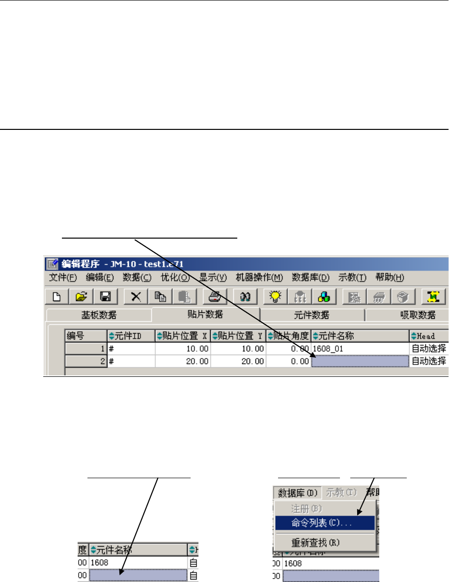 ① 请单击空白的元件名称栏。 ② 请单击「数据库」/「命令列表」。