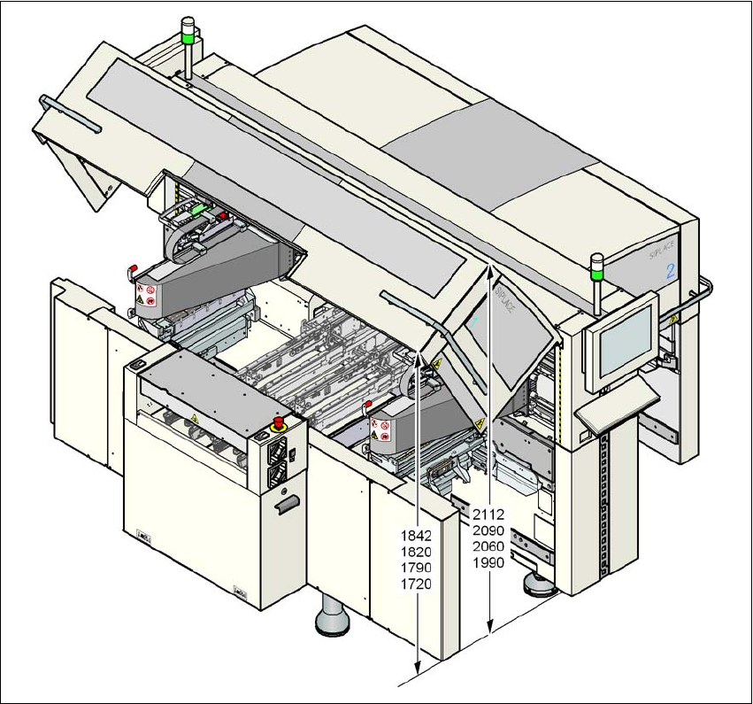 Betriebsanleitung SIPLACE D3 3 Technische Daten des Automaten Ab Softwareversion SR.605.xx Ausgabe 07/2008 DE 3.3 Abmessungen und Gewicht 103 3.3.3 Höhe der aufgeklappten Schutzhaube 3 Abb. 3.3 - 2 Höhe der aufgeklappten…