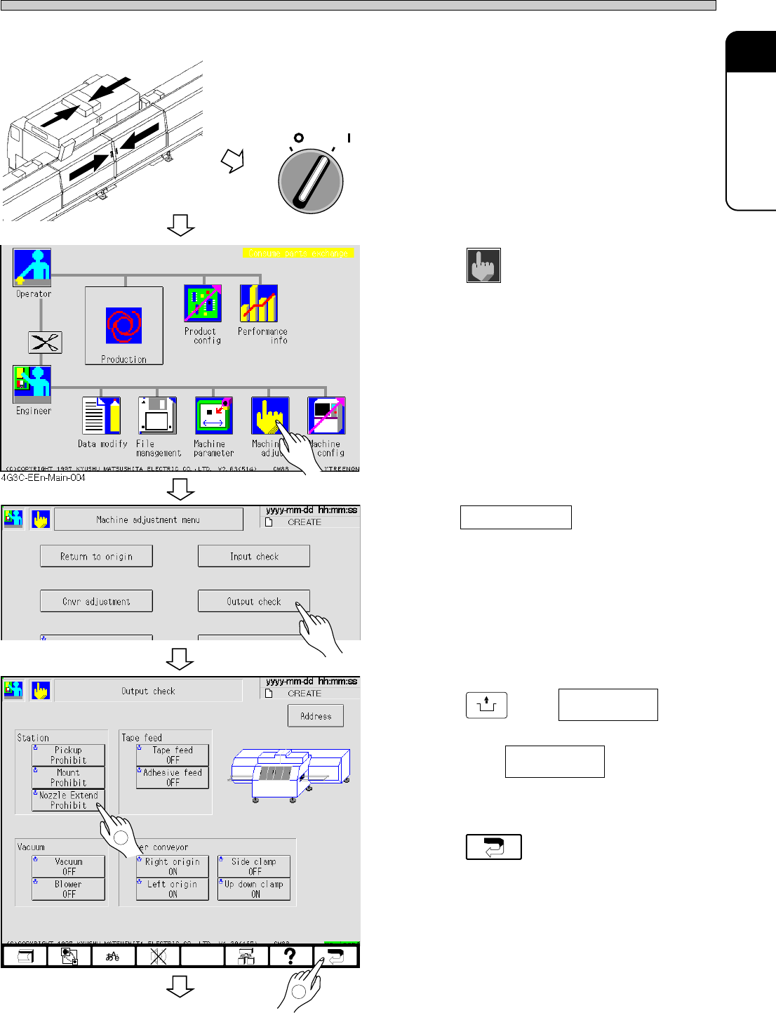 Page 1-97 REGULAR MAINTENANCE 1 3Y3C-E-MMD01-A09-02 OFF ( ) ON ( ) SERVO 3Y3C-AG01 T o the next page Nozzle Extend Prohibit Nozzle Extend Permission 3Y3C-EEn-MaOc-001 2 1 Changing the Consumable Parts Every 1500 to 6000 …