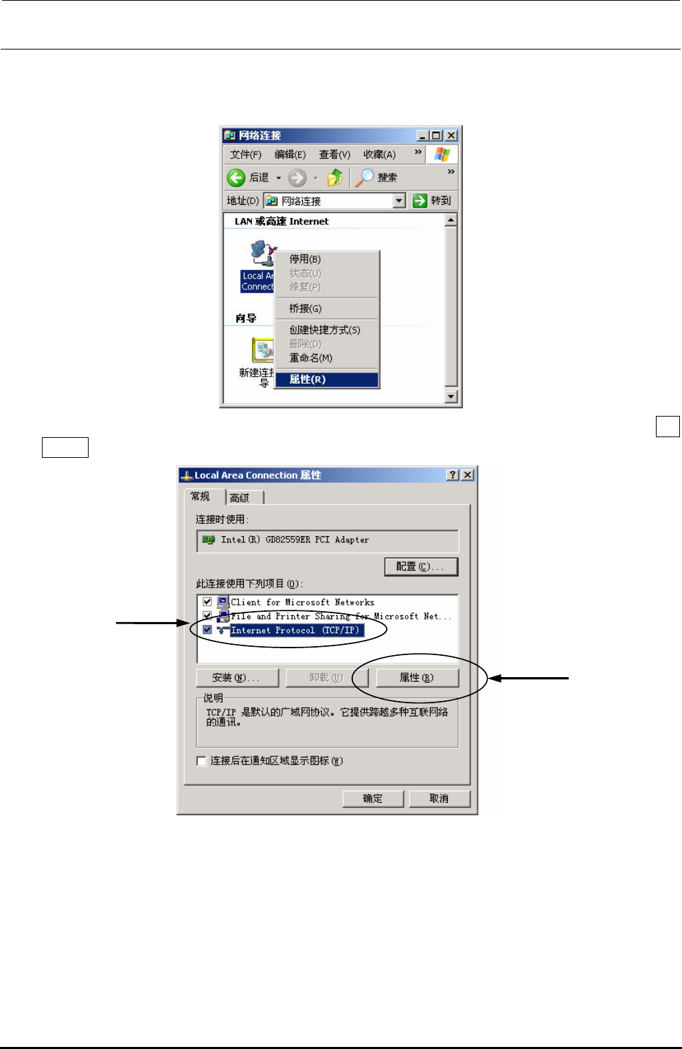 维修调整要领书 12-14 Rev1.0 3) 于是显示“网络连接”的对话框 。请从其中选择“LocalArea Connection”图标, 击鼠标右键, 选择“属性(R)”。 4) 显示[本地连接的属性]对话框。 请在这对话框内选择①“Intern et Protocol ( TCP/IP)”, 按② [ 属 性(R)] 按钮。 ① ②