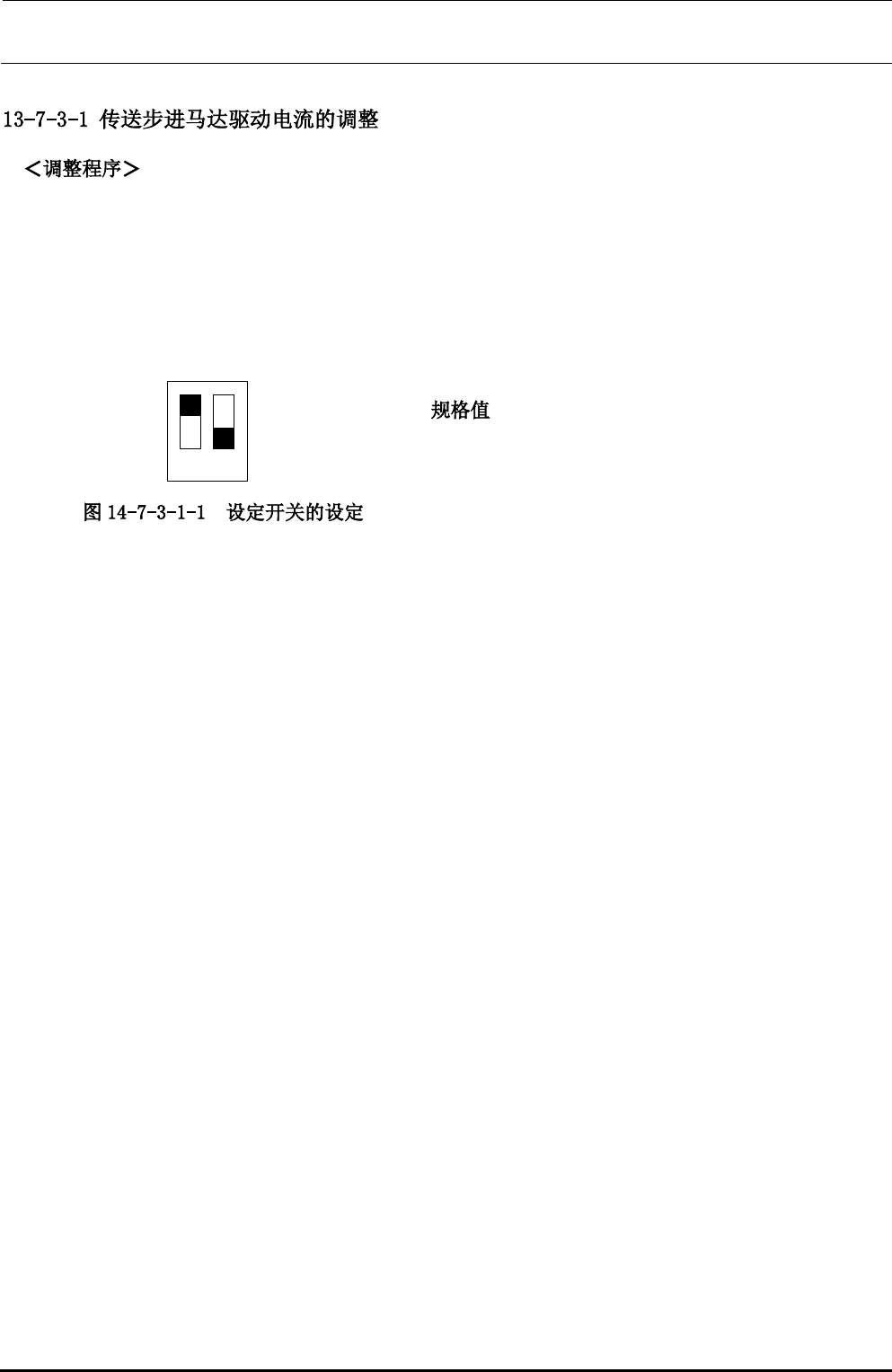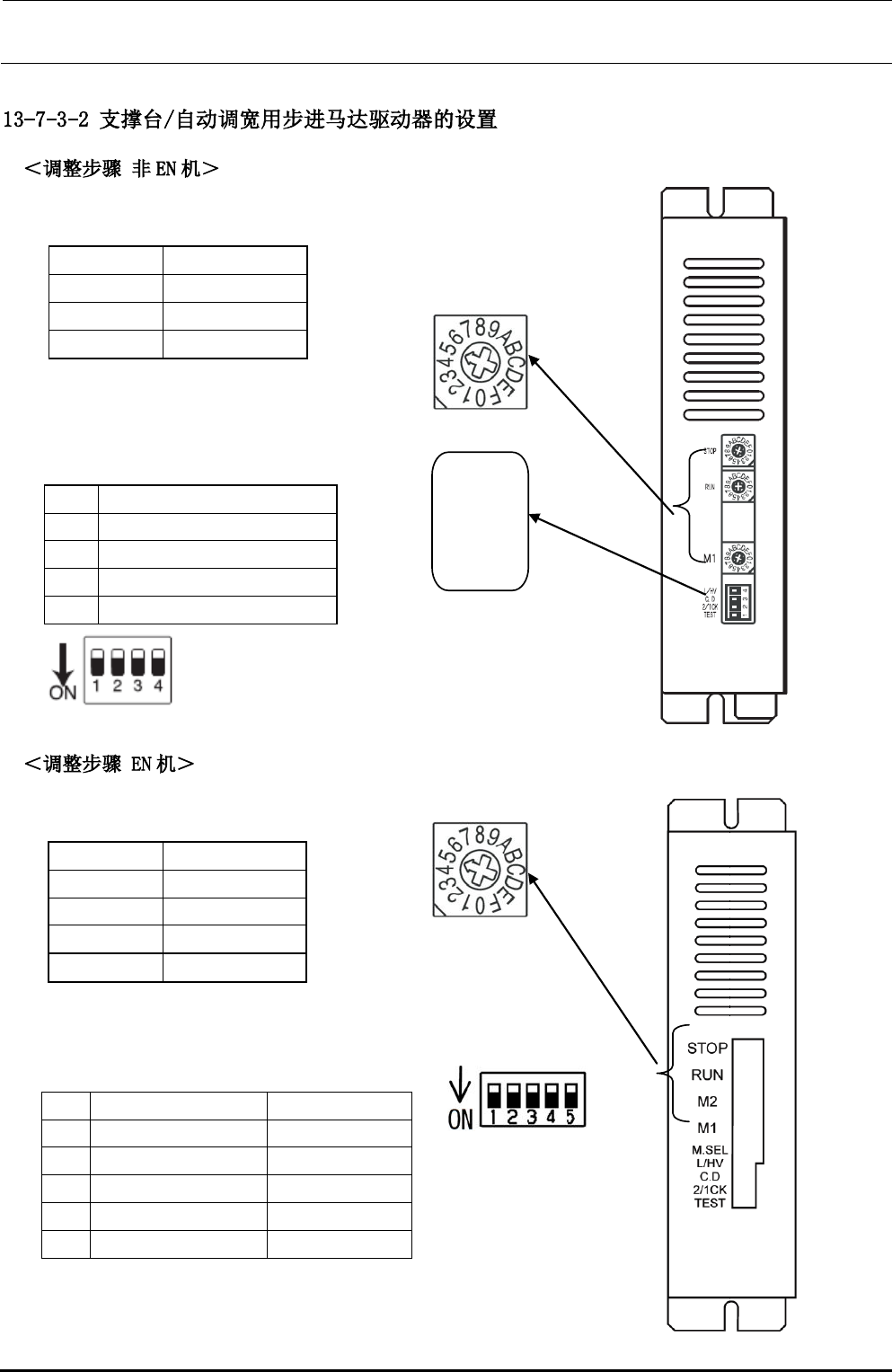 维修调整要领书 13-37 Rev2.0 ① 调整前,请确认『 DC 电源输出电压的调 整』。 ② 转动传送步进马达,用数 字万能表测定5相步进驱 动器上的『 CP1 』,『 CP2 』端子的 电压。 数字万用表的连接 ,『 CP 1 』为”+”,『 CP 2 』为”-”。 ③ 慢慢转动『 RUN 』旋钮,让『 CP1 』 ~『 CP2 』之间的电压为 2.8 V±0.01V 。 ④ 请把步进驱动器上的步进 SW 设定如下图 所示。 驱…