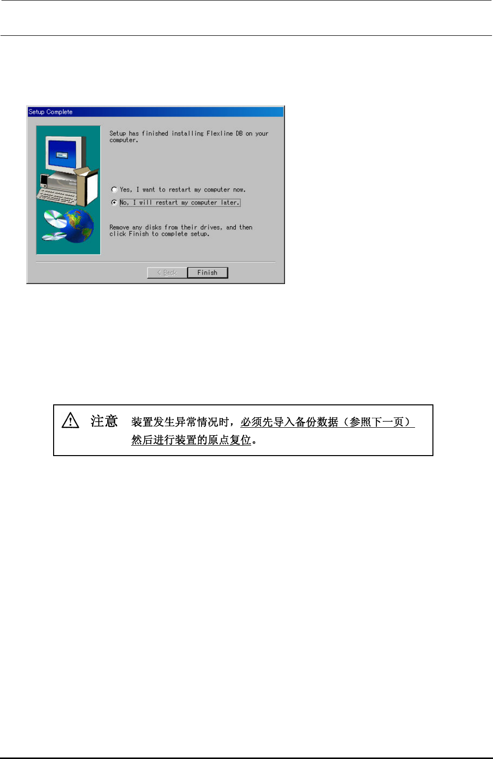 维修调整要领书 12-29 Rev1.0 7) 安装结束后,出现配置完成的画面 。 请选择「No,Iwillrestartm ycomputerlater.」,点击[Finish]按钮, (在 C 驱动器的更新操作结束后再 重新启动。) 8) 请按照「12-4-7C 驱动器的更新操作」 进行 C 驱动器的更新。 ※ 注意 如果不进行 C 驱动器的更新操作就重新启动,则由于 C 驱动器的保护功能,…