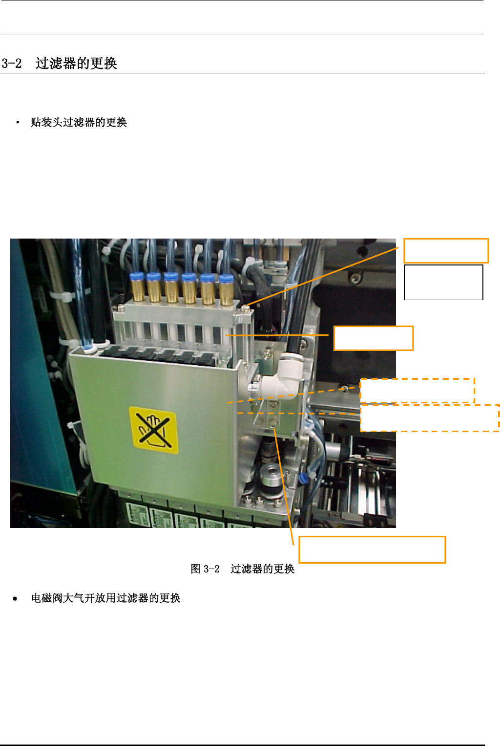 维修调整要领书 3-2 Rev1.0 降低主体的原压力,进行更换。 1) 先拆卸①cap(×2),再拆卸过滤器箱 U。 (过滤器箱 U 下面有 O 形环。 注意不要弄丢。) 2) 取出过滤器并进行更换。 3) 装配请按相反的步骤进行。 4) 更换后请用手动控制贴装头真空计并按 ON/OFF 的方式进行确认。 1) 先拆卸②带垫片内六角螺钉(×4)再拆 卸贴装头保护罩。 2) 拧松③螺钉(×2)…