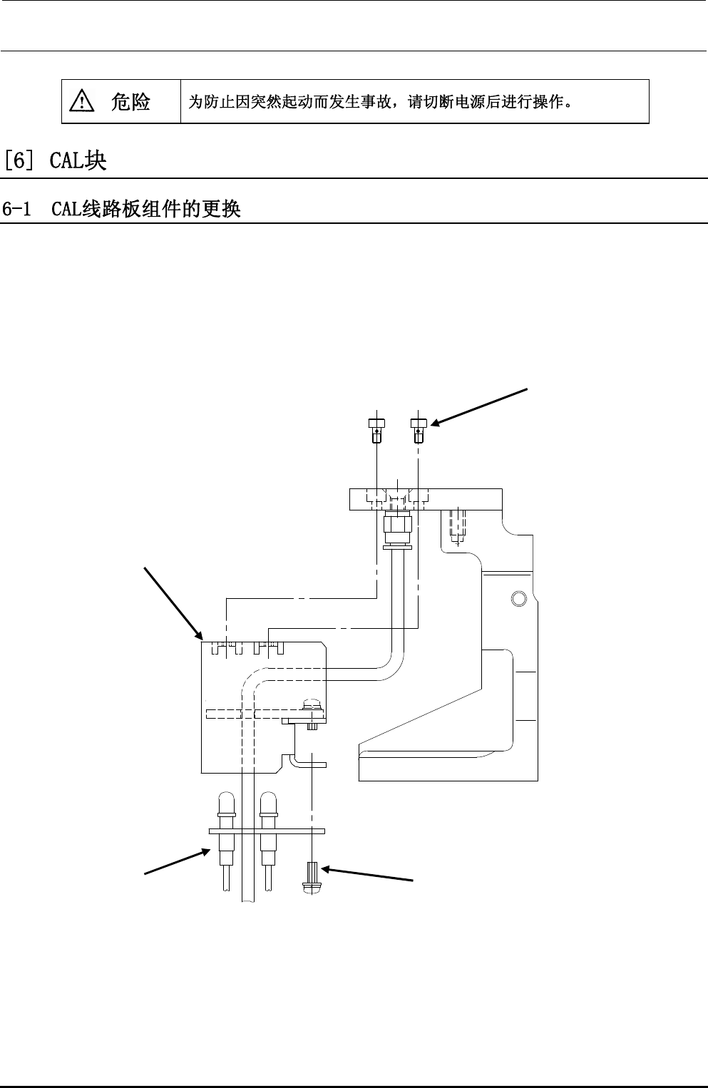 维修调整要领书 6-1 Rev1.0 1) 把与 CAL 线路板相连的 2 条电 线①拔下。 2) 把φ4 的空气管从脱膜部件的弯管 上拔下。 3) 卸下 CAL 板上的两处内六角螺钉 ②,取下 CAL 护罩 ③。 4) 卸下两处带垫片螺钉④,从 CA L 护罩上取下 CAL 线 路板。 5) 线路板更换后,按照相反的顺序组 装。 ① ② ④ ③