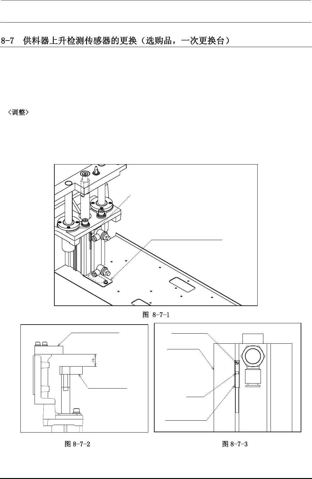 ②如下图(图 8-7-2)所示,使供料器支架和供料升降器之间的间隙为 28mm。