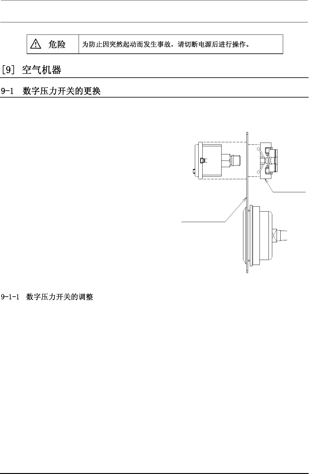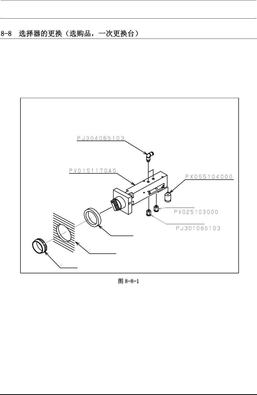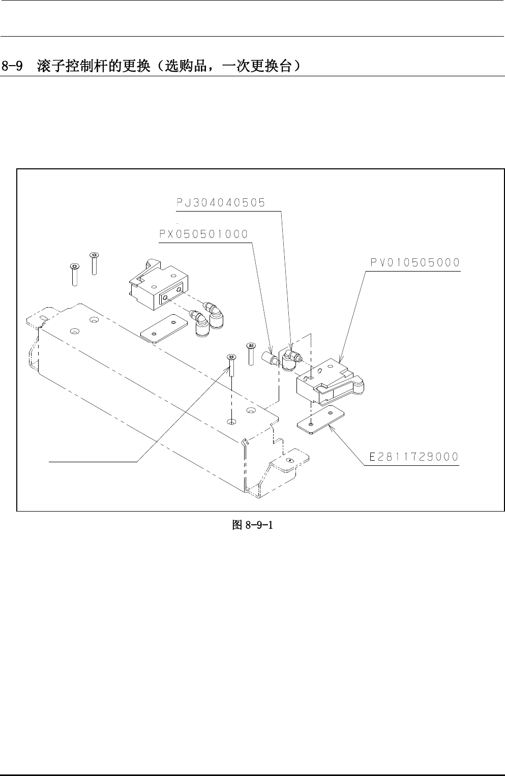 维修调整要领书 8-10 关闭空气管后进行更换。 下图(图 8-9-1)是 F R(前右)RL(后左)的情况。 FL(前左)RR(后右)的情况时,消音器的位 置在图示位置的 对称处。 弯头 消音器 十字螺钉 M4×25 机械阀 阀平板 Rev1.0