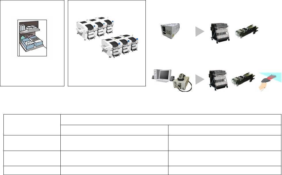 NPM-W 2014.0303 - 68 - 5.5 支援站 使用客户持有的预备交换台车和料架 ,在生产中可以进行下一机种的准备,大幅度减少机种切换 的损失时间。 类型有对交換台車和料架供给电源, 和供给电源并且可以进行元件校对的 2 种。 ※ 使用料架自由配置功能时,需要 元件校对类型。 功能类型 可以从电源供给、元件校对的 2 种类型中选择。 ①电源供给类型 : 对交换台车和料架供给电源。 ②元件校对类型 : 对交换台车和料架可以供…