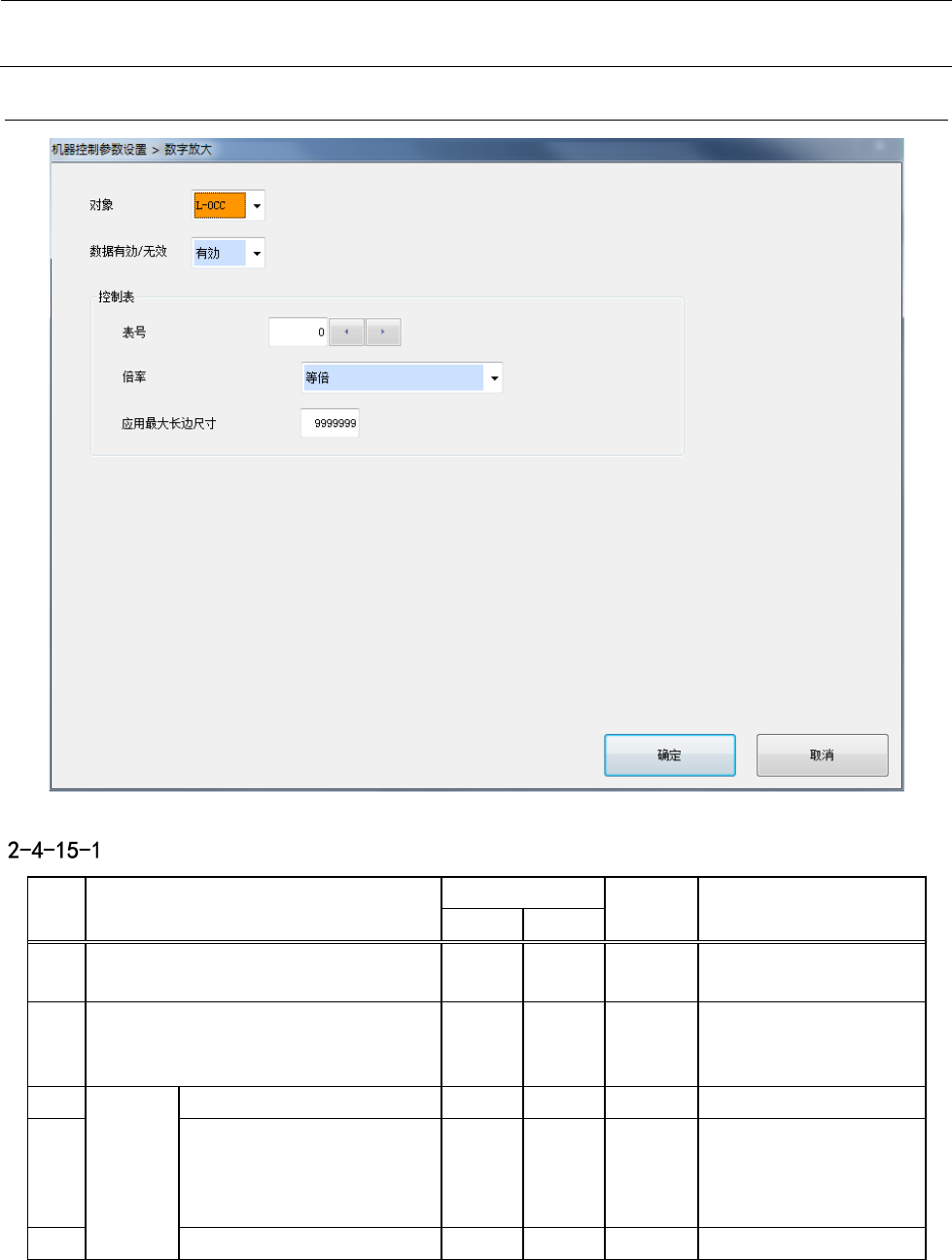 机器控制参数 2- 111 2-4-1 5 数字放大 设定项目 No. 项目 输入范围 单位 备考 最小值 最大值 1 对象 0 1 0 : L- OCC 1 :预备 2 数据有效/无效 0 1 0 :无效 1 :有效(默认) ※ 3 控制表 表号 0 3 4 倍率 0 3 0 :等倍 1 : 2 倍 2 : 4 倍 3 :未设定 5 应用最大长边尺寸 ※ 在“数据有效 / 无效”选择了“无 效”后,以后的项目不能编 辑。