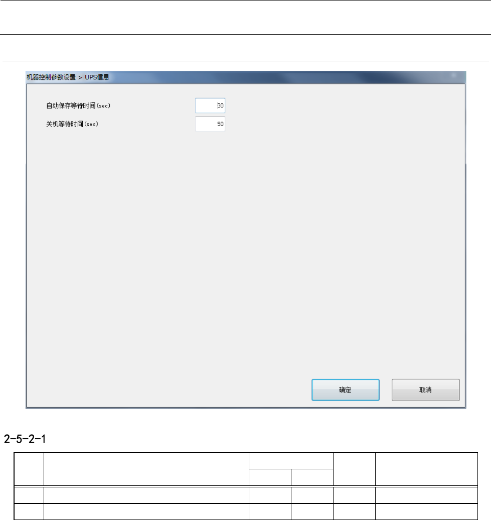 机器控制参数 2- 118 2-5- 2 UPS 信息 设定项目 No. 项目 输入范围 单位 备考 最小值 最大值 1 自动保存等待时间 [sec] s ec 2 关机等待时间 [sec] sec