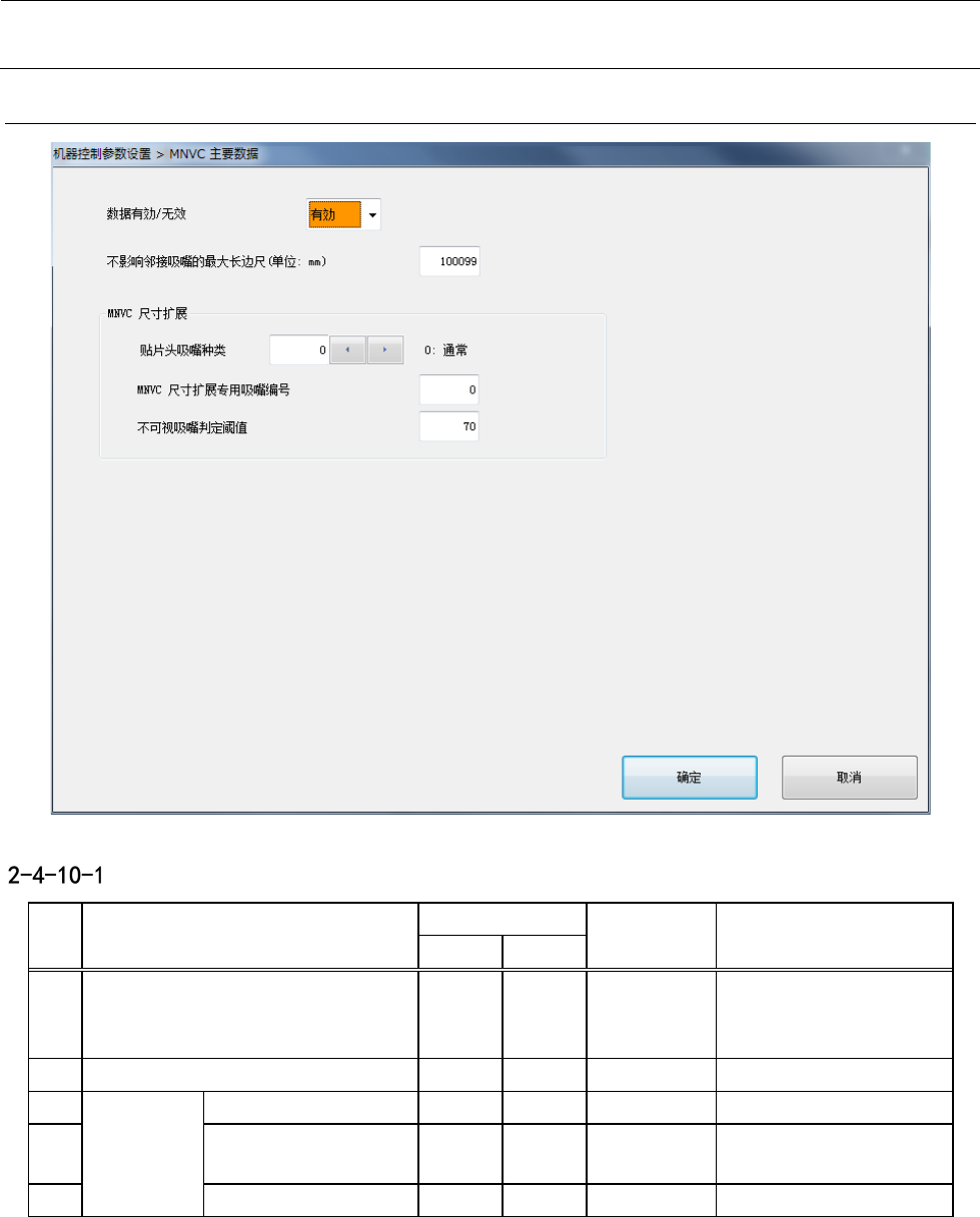 机器控制参数 2- 103 2-4-1 0 MNVC 主要数据 设定项目 No. 项目 输入范围 单位 备考 最小值 最大值 1 数据有效 / 无效 0 1 0 :无效 1 :有效(默认) ※ 2 不影响邻接吸嘴的最大长边尺 mm 3 MNVC 尺寸 扩展 贴片头吸嘴种类 0 2 4 MNVC 尺寸扩展专用吸 嘴编号 0 65535 5 不可视吸嘴判断阈值 0 65535 ※ 在“数据有效 / 无效”选择了“无 效”后,以后的项目不能编…