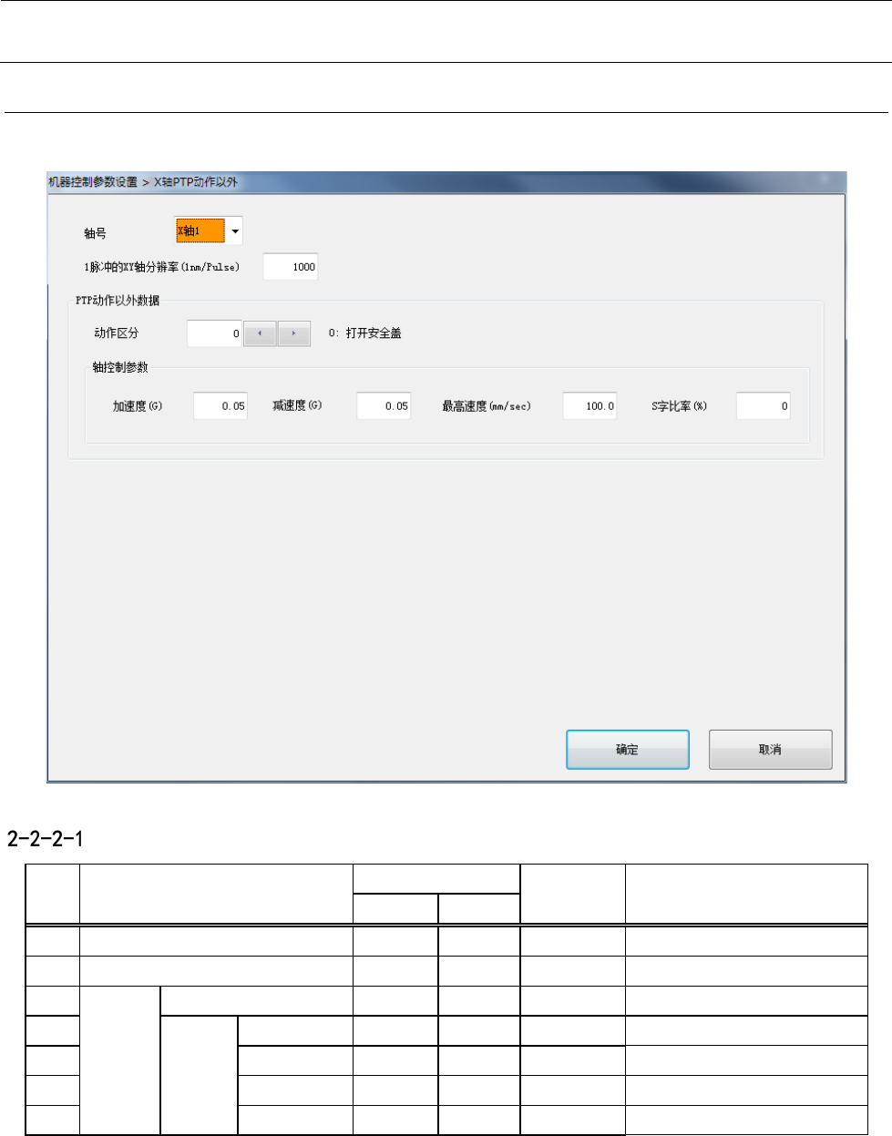 机器控制参数 2- 34 轴号 速度区分 行程区分 No. 类别 内容 1 0 X 轴 1 No. 类别 内容 1 0 高速 2 1 中速 3 2 低速 4 3 低速 2 5 4 高速 2 6 5 高速 B 7 6 高速 2B 8 7 ~ 9 预备 No. 类别 内容 1 0 s <= 1mm 2 1 1mm < s <= 2 mm 3 2 2mm < s <= 4 mm 4 3 4mm < s &l…