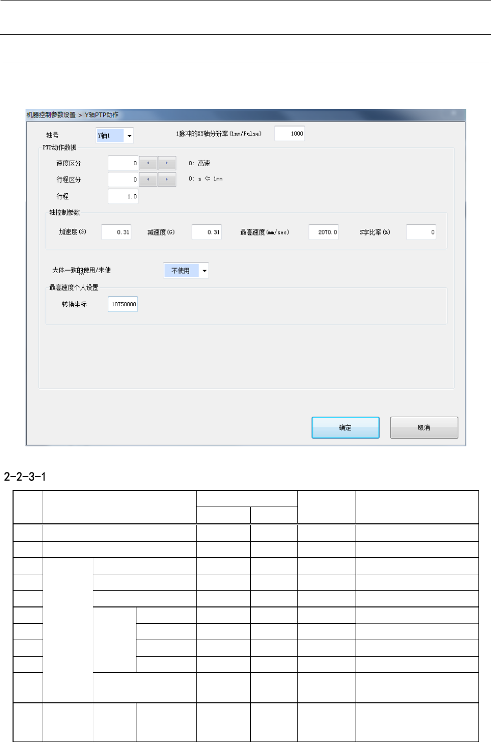 机器控制参数 2- 37 2-2- 3 Y 轴 PTP 动作 如 将“ 轴号” 、 “速度区分” 、 “行 程区分” 设置为欲编辑的索引 , 即可对所设定的区分中的轴控 制参数进行编辑。 设定项目 No. 项目 输入范围 单位 备考 最小值 最大值 1 轴号 参照 2-2-3-2 轴号 2 1 脉冲的 XY 轴分辨率 nm / Pulse 3 PTP 动作 数据 速度区分 0 9 参照 2 -2-3-3 速度区分 4 行程区分 0 19…