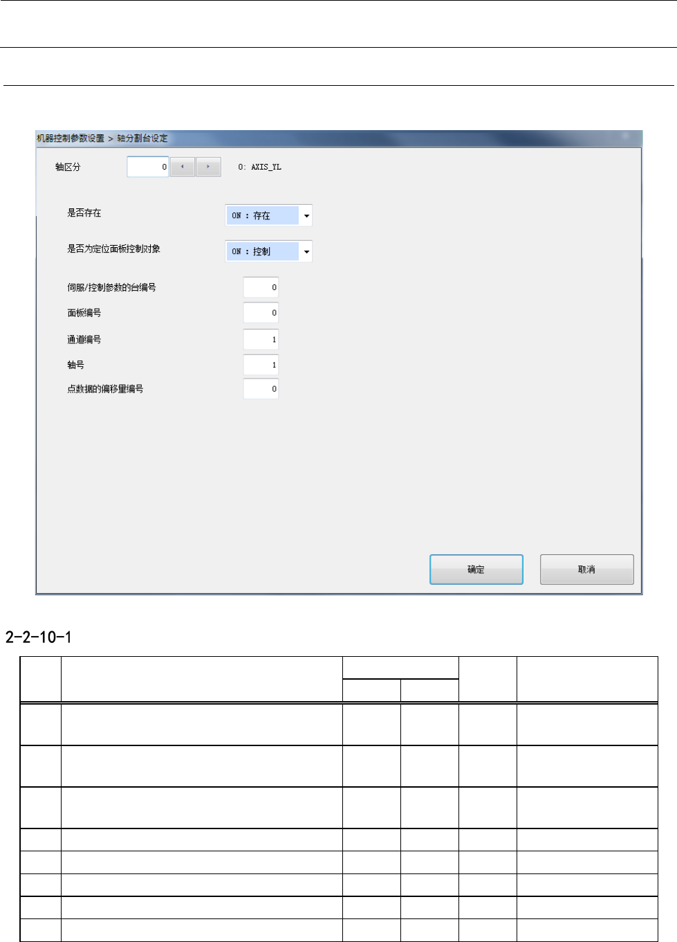 机器控制参数 2- 72 2-2-1 0 轴 分割台设定 如将 “轴区分”设置为欲编辑的索引 ,即可对所设定的区分中的轴 参数进行编辑。 设定项目 No. 项目 输入范围 单位 备考 最小值 最大值 1 轴区分 0 31 参照 2-2-10-2 轴区 分 2 是否存在 ON :存在 OFF :不存在 3 是否为定位置板控制对象 ON :控制 OFF :不控制 4 伺服 / 控制参数的台编号 5 面板编号 6 通道编号 7 轴号 8 点数…