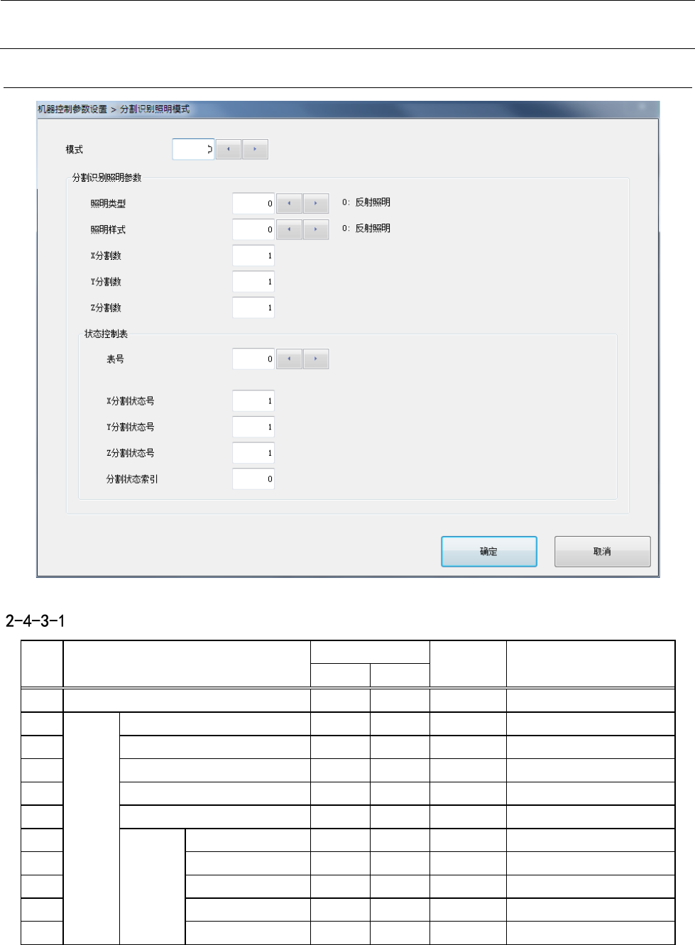 机器控制参数 2- 90 2-4- 3 分割识别照明模式 设定项目 No. 项目 输入范围 单位 备考 最小值 最大值 1 模式 0 63 2 分割 识别 照明 参数 照明类型 0 2 55 参照 2-4-3-2 照明类型 3 照明样式 0 255 参照 2-4-3-3 照明样式 4 X 分割数 1 2 5 Y 分割数 1 3 6 Z 分割数 1 2 7 状态 控制表 表号 0 15 8 X 分割状态号 1 2 9 Y 分割状态号 1 …