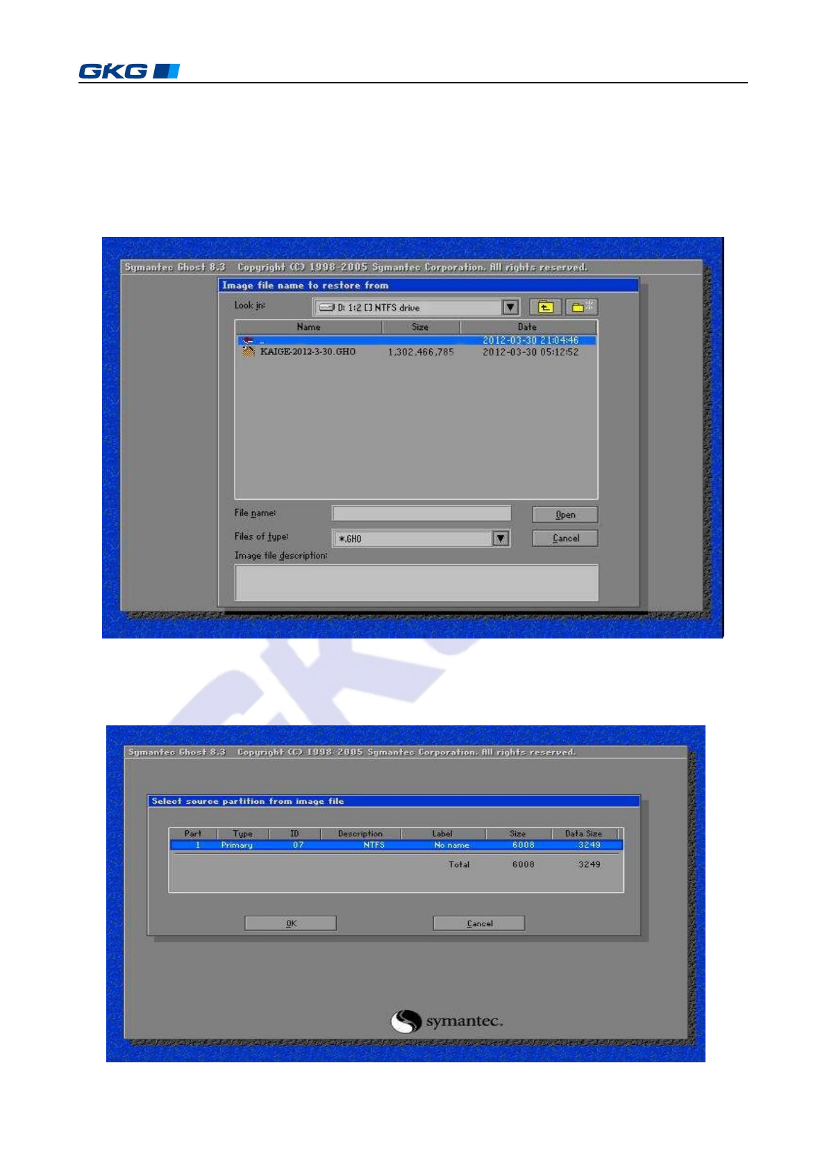 13 凯格精密机械有限公司 13 图 2-7 4、选择镜 像文件保 存的位置 ,此时按下 “ Shift+Tab ”键可 以切回到 选择分区 的下拉菜 单, 按上下键选择分区, 例如 “ 1:2 ” 的意思就是第一块硬盘的第二个分区, 也就是 “ D ” 盘, 选好分区后,再 按 Tab 键切 到文件选择 区域,用上下键 (或者使用 鼠标)选 择备份所在 文件 夹,也就是 .gho 的文件。 (图 2-8) 图 2 -8 5、此时的图例…