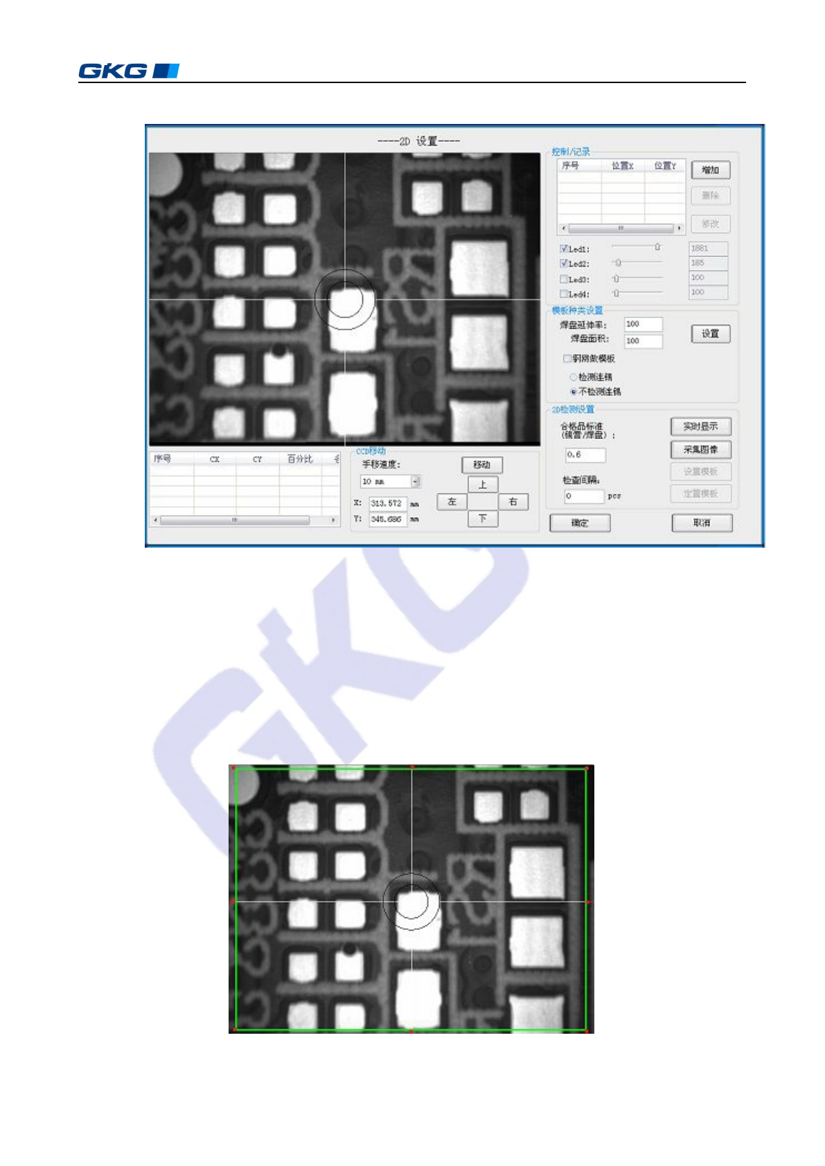 凯格精密机械有限公司 30 图 4 -14 〈 2D 设置〉对话框 3 ) 单击 [2D 设置 ] 对话框中的“增加”按钮,增加一组数据。 4 ) 调节 LED1 、 LED2 的亮度,取得较好的画面效果。 5 ) 利用键盘上的箭头键(←↑→↓)或用鼠标进行视野的移动,确定取像位置。 6 ) 单击 “实时显示” , “采集图像” , “设置模板” , 随后在图像区域会出现一个绿色的 方框,如图 4 -15 所示: 图 4-15