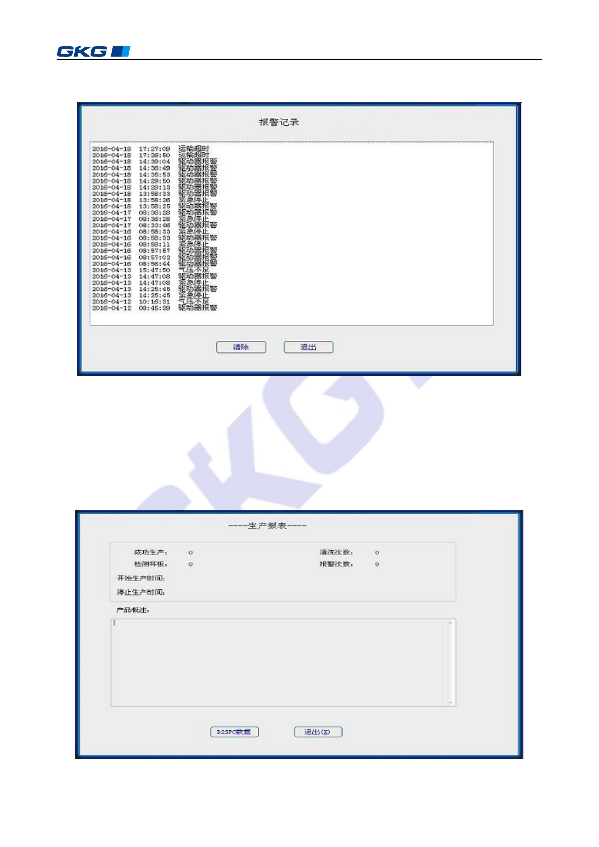 39 凯格精密机械有限公司 39 所示。显示当 时和以往的 报警记录, 单击“清除” ,清除所 有报警记录 ;单击“退出” ,回到 主窗口。 图 4 -27 〈报警记录〉对话框 4.3.4.3 生产报表 显示已进行的有关生产记录并可记录下相应产品的概况。操作步骤如下: 在主画面工具栏 2 中单击 “生产报表” 图标按钮, 出现 [ 生产报表 ] 对话框。 显示成功生产 数量、检测坏板 数量、清洗 次数、报警 次数、开 始生产和停 止生产…
