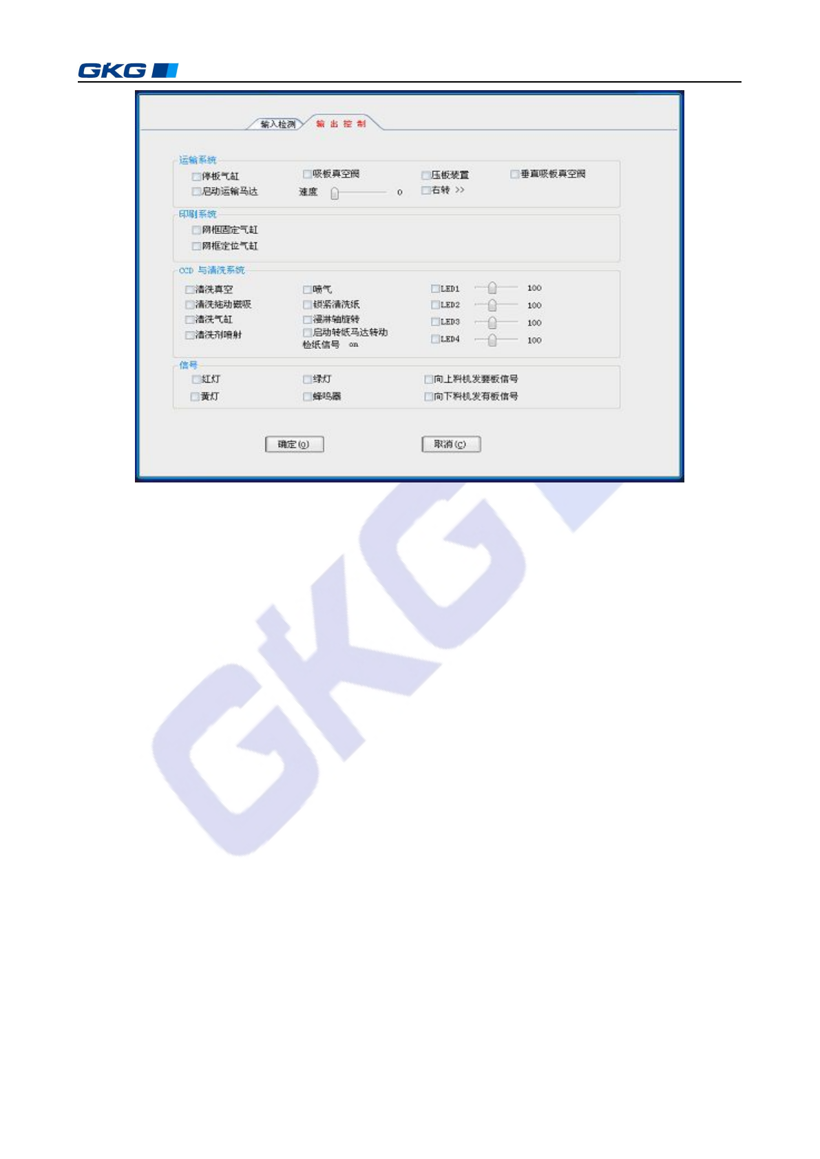 43 凯格精密机械有限公司 43 图 4 -36 〈输出检测〉对话框 (1) 、 运输系统栏: 包括停板气缸 、 吸板真空阀、 启动运输马达 、 压板装置、 导轨锁紧气 缸、垂直吸板真空等操作。 (2) 、印刷系统栏:包括对网框的固定,定位操作。 (3) 、 CCD 与清洗系 统栏:主 要包括清 洗真空的 开启、清 洗电磁铁 的磁吸、 清洗气缸的 升降、 清洗剂的喷射、 转纸马达的转动、 浸淋轴的旋转以及实现来回清洗时使用到的清 洗纸锁…