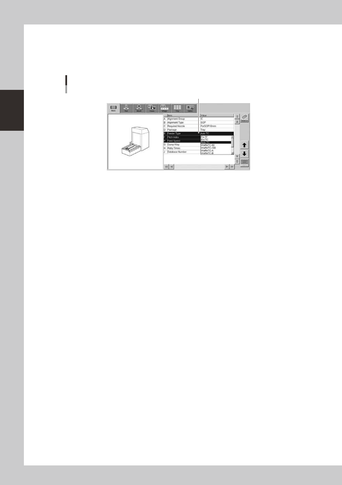 2-53 2 asic operation 7 Set the “Pitch Index” and “Feed Timer Offset” parameters. • T ape components: Double-click the "Pitch Index" parameter field an d select a correct feed pitch from the drop-d own list.…